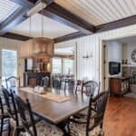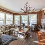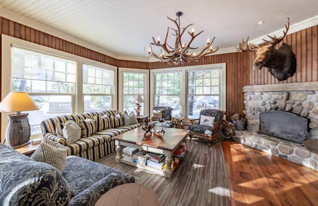 Spacious open concept with 2 chairs, ottoman, 2 love seats, extra chairs, wood burning fireplace and walkout to patio