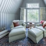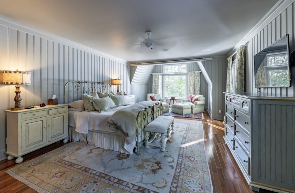 - Bedroom 1 – King (Primary) with ensuite, TV, 2 chairs with ottomans and walk-in closet