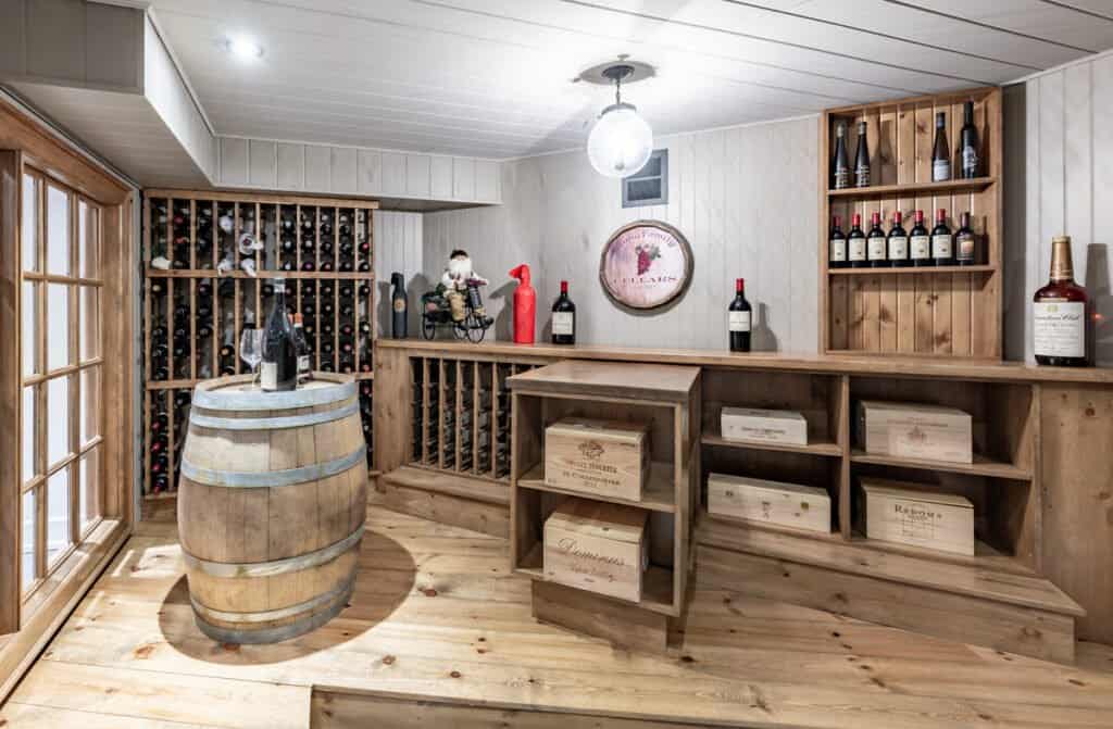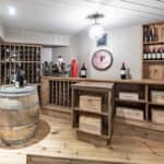 Lower boathouse equipped with 1 interior slip, cabana area, wet bar with wine fridge, shuffleboard, infrared heater above seating area with 2 love seats and 2 chairs