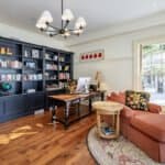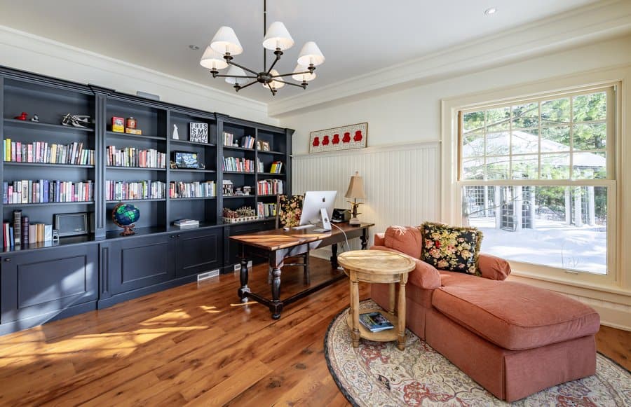 Large windows, bookshelf, 2 desks and chair with ottoman