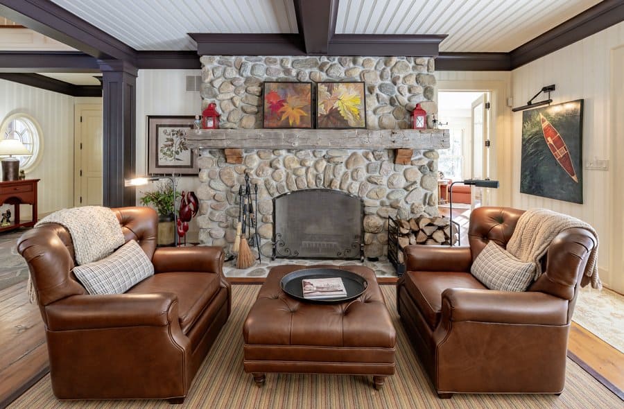 Separate room with wood burning fireplace, TV, large 6 person sofa and chair