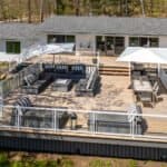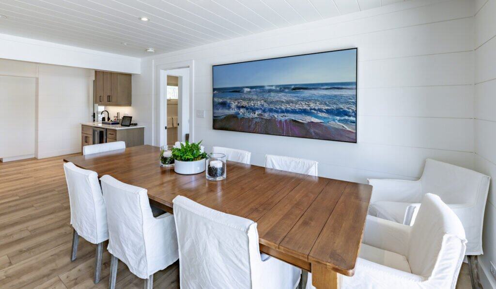 Open concept with seating for 12, walkout to back deck and a bar area with wine fridge and sink.