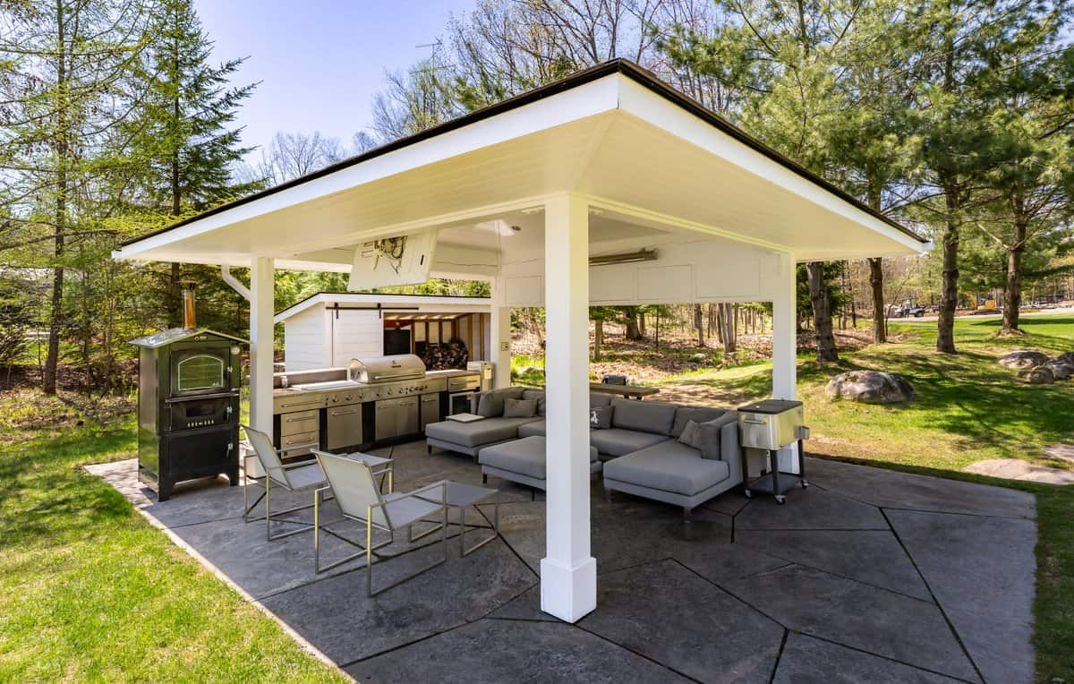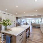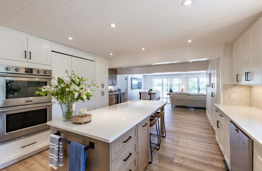 Bright open concept with 2 dishwashers, double stove, cooktop oven, island seating for 4 and a walkout to deck with an extra outdoor fridge and freezer.