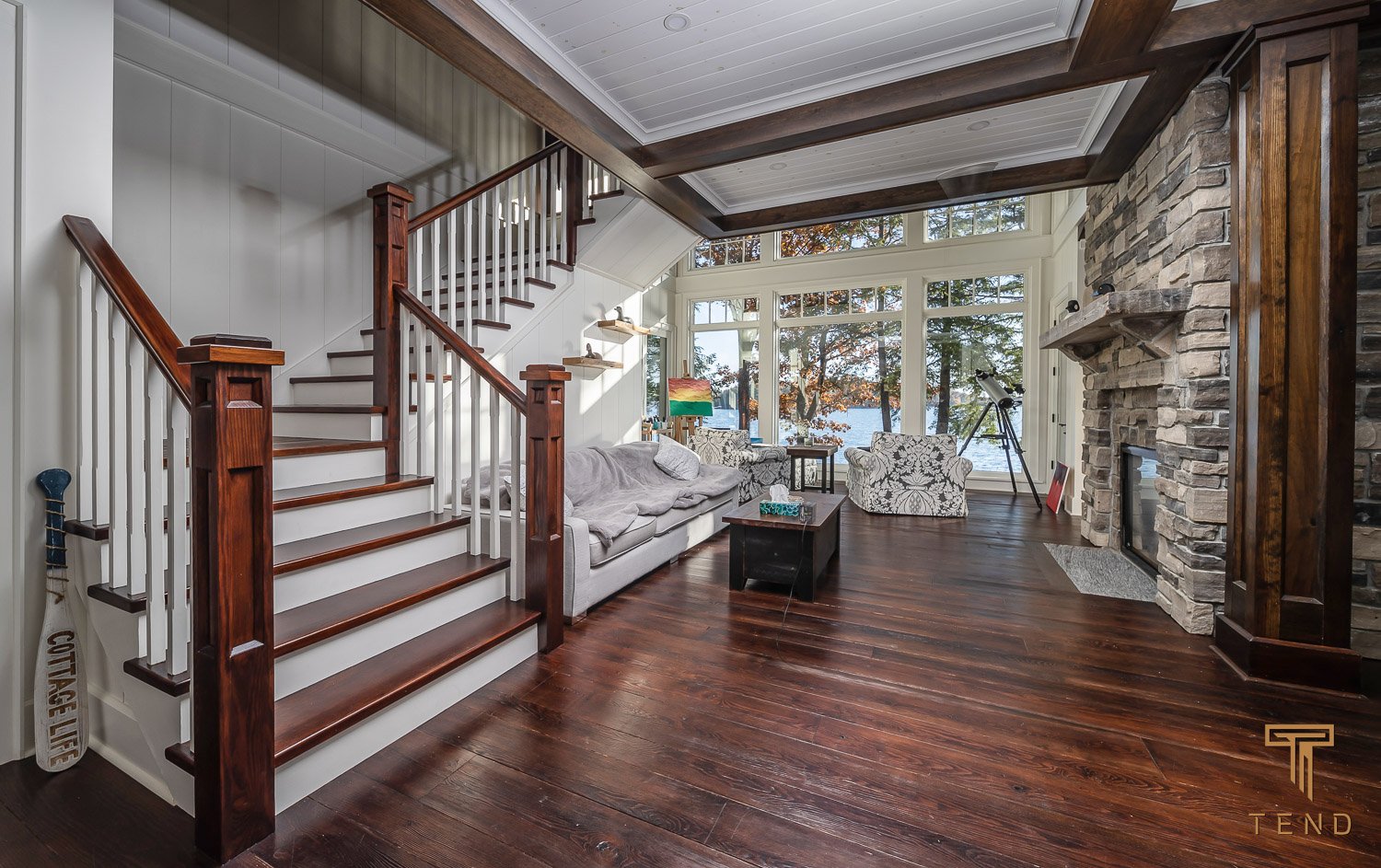 2 large chairs in front of huge lakeview cathedral windows