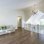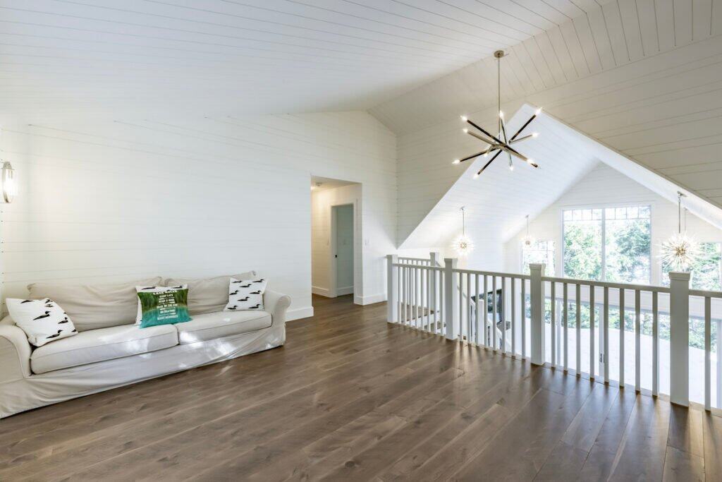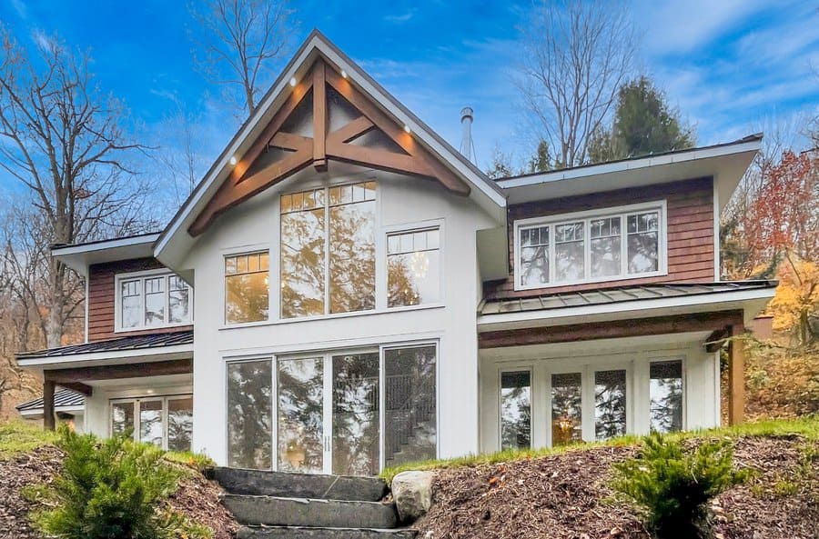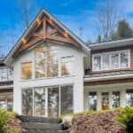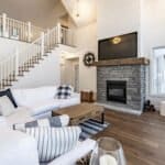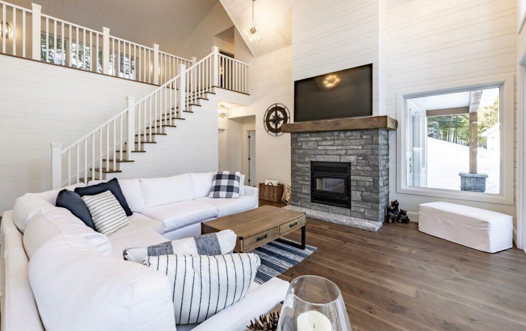 Features a towering wood-burning fireplace surrounded by an L-shaped sofa. Floor-to-ceiling windows offer beautiful views of the lake.