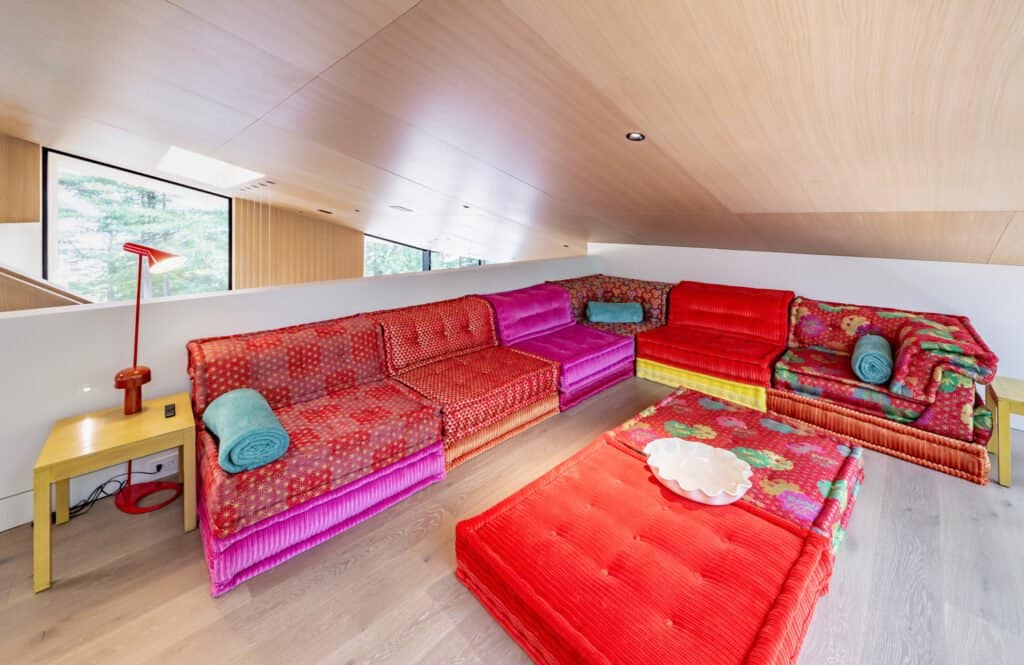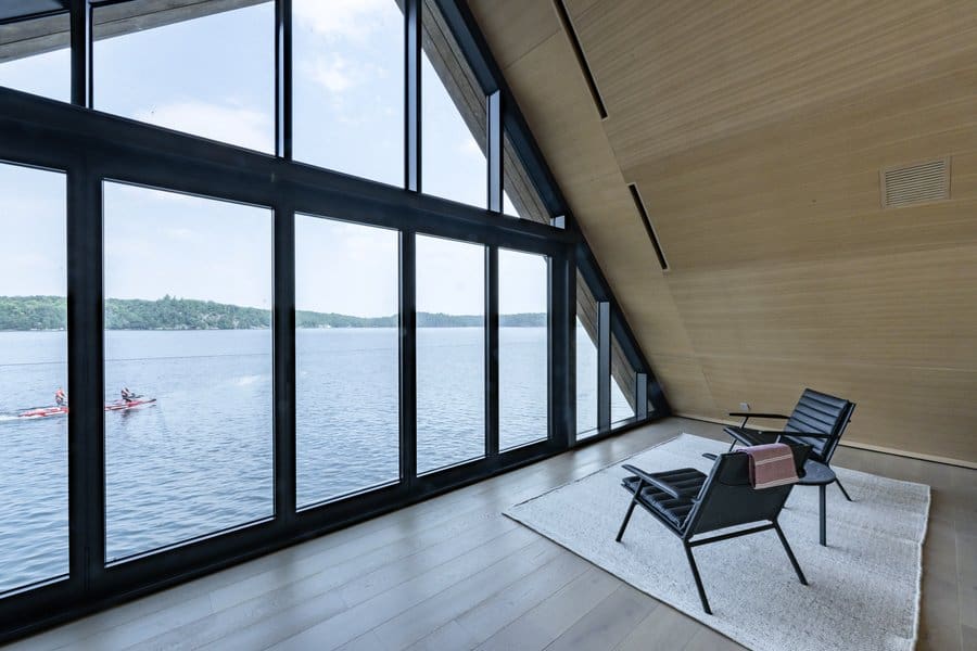 Mezzanine with 2 chairs overlooking the great room/dining room. Balcony with seating looking towards boathouse.