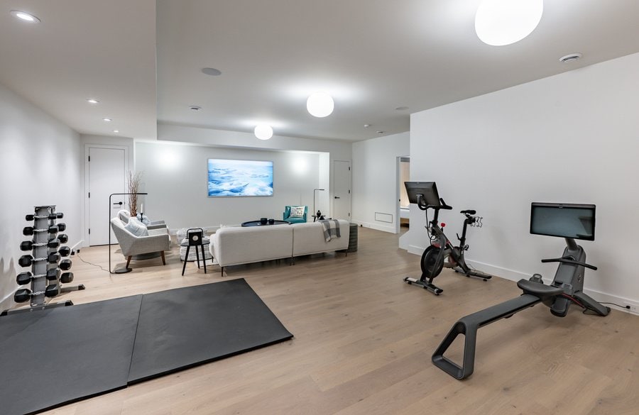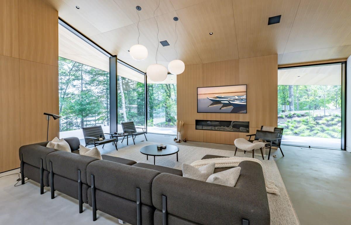 Features floor to ceiling windows and a gas fireplace with TV surrounded by a beautiful sectional sofa.