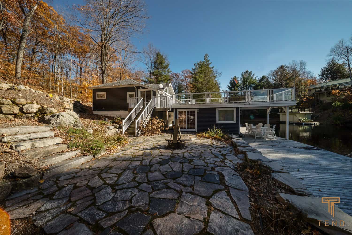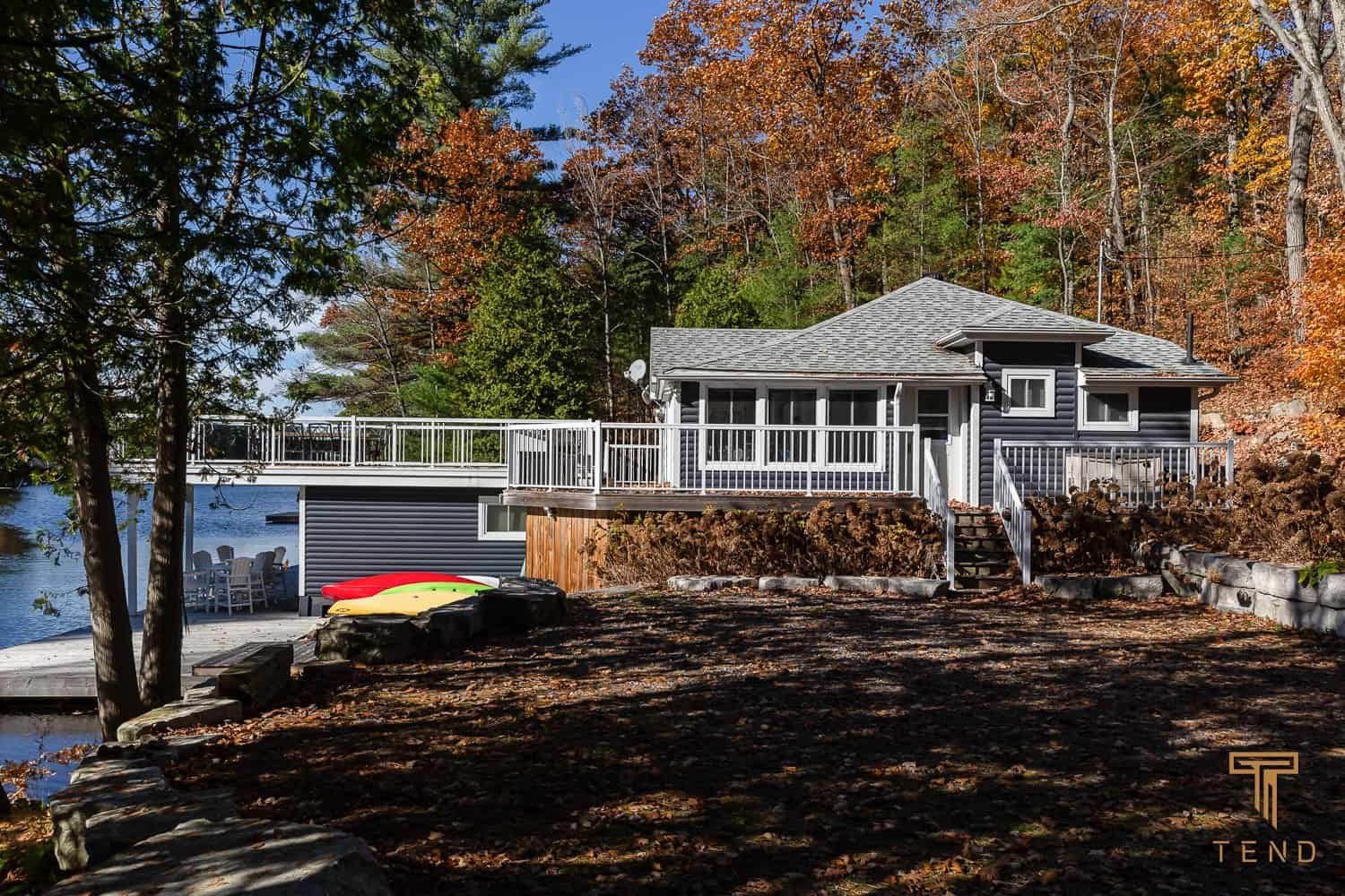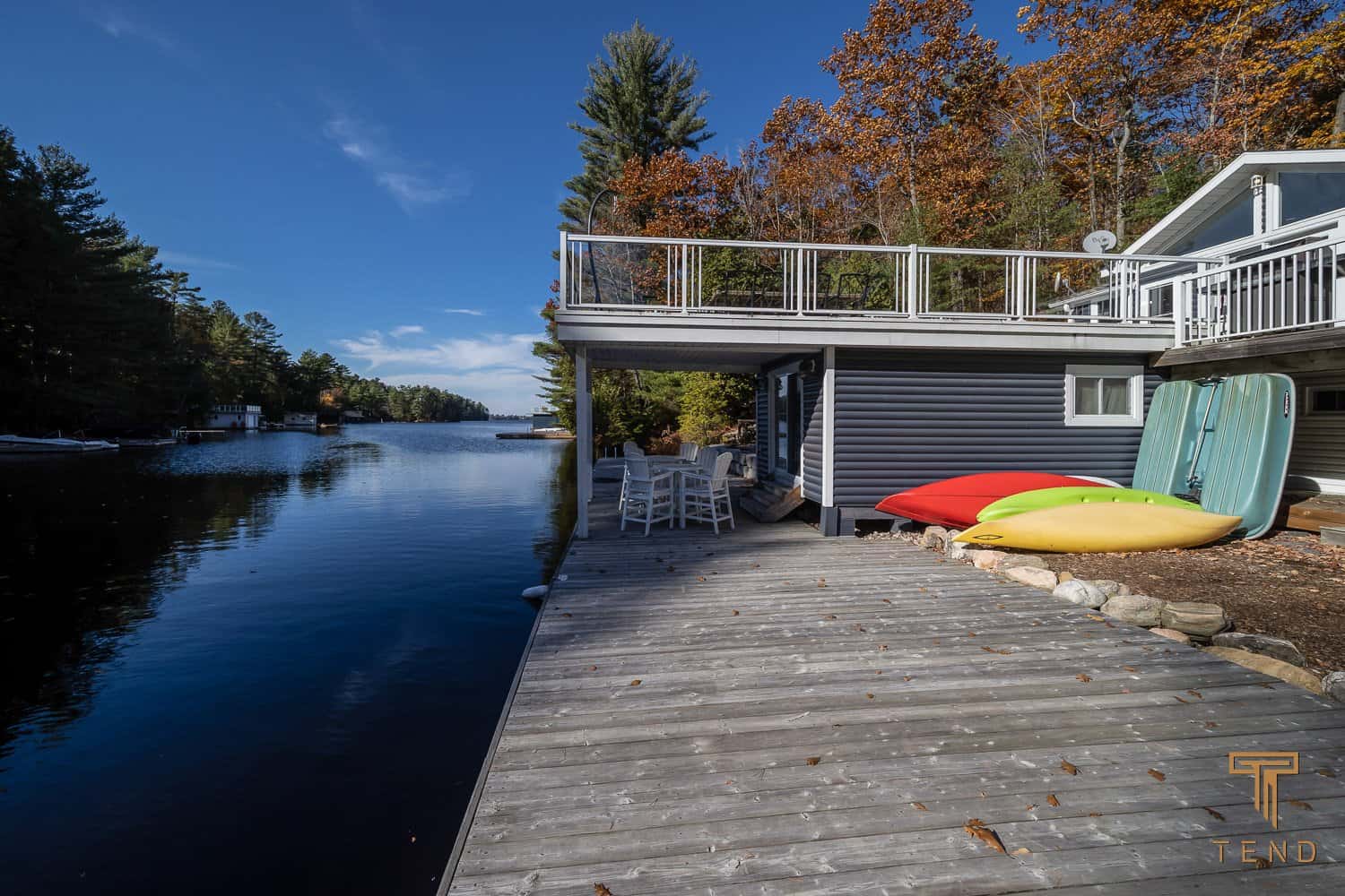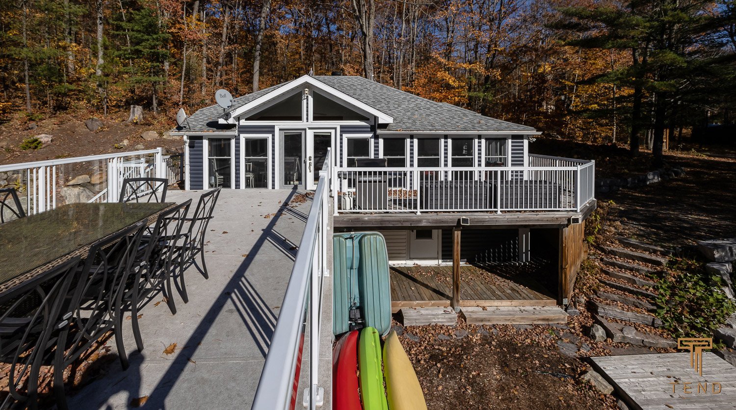 Dark Bay Road is set in the true Muskoka landscape. Enjoy your morning coffee with a perfect water view from the beautiful Muskoka seating indoors or outdoors on the huge deck. Cook a delicious meal in the well-equipped kitchen or snuggle up on the large, comfy sectional to watch a movie after a long day on the water. This property includes the perfect lakeside fire pit, where you can end your day enjoying some delicious smores.