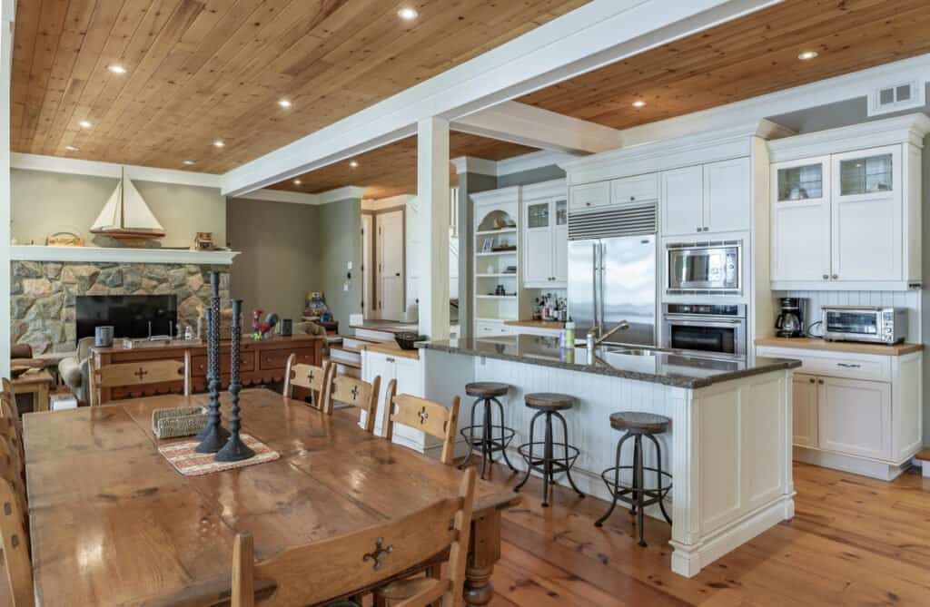 Charming country-style kitchen features fridge/freezer, oven, microwave and dishwasher. An island with 3 barstools is centred in the heart of the kitchen with a sink and dishwasher. Also featured is a gas range with 6 burners.