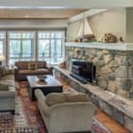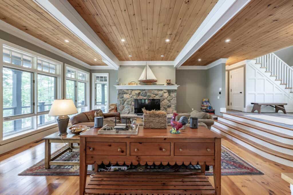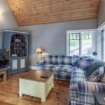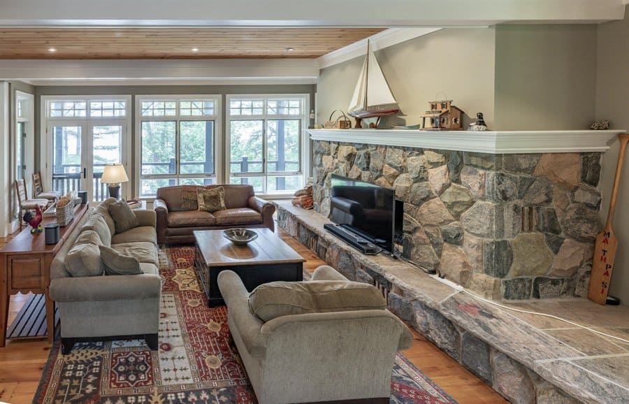 Step down into a cozy, open concept room adorned with pine floors, 2 sofas and a chair surrounding a traditional wood‑burning fireplace and TV.