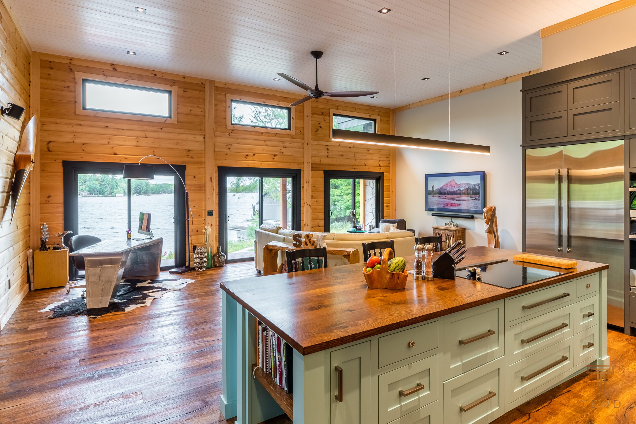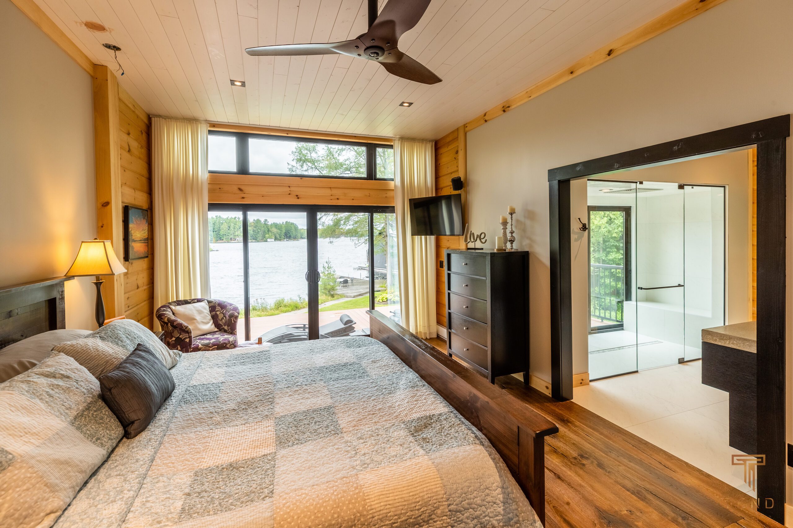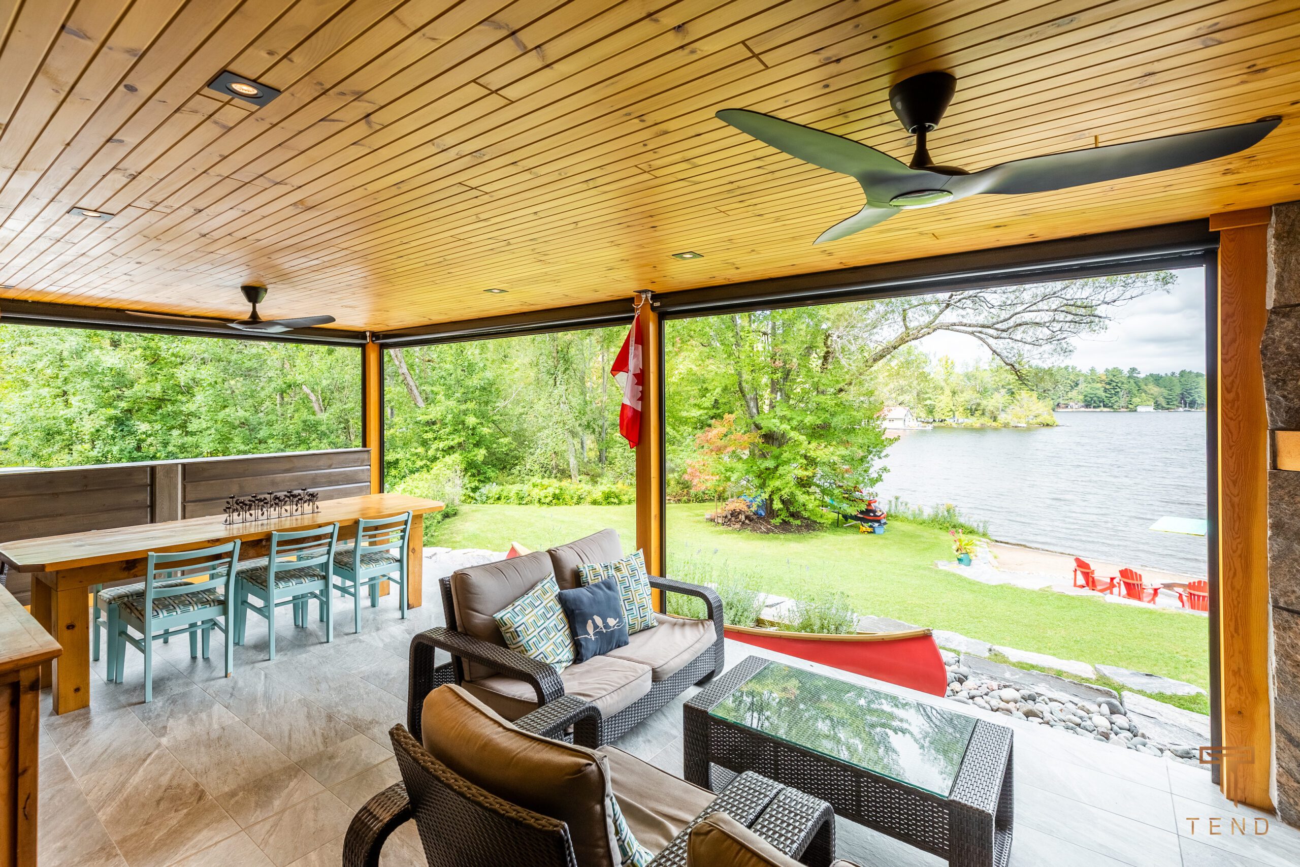 Dock, beach, flat grass, four-season, Muskoka room, indoor/outdoor fireplace