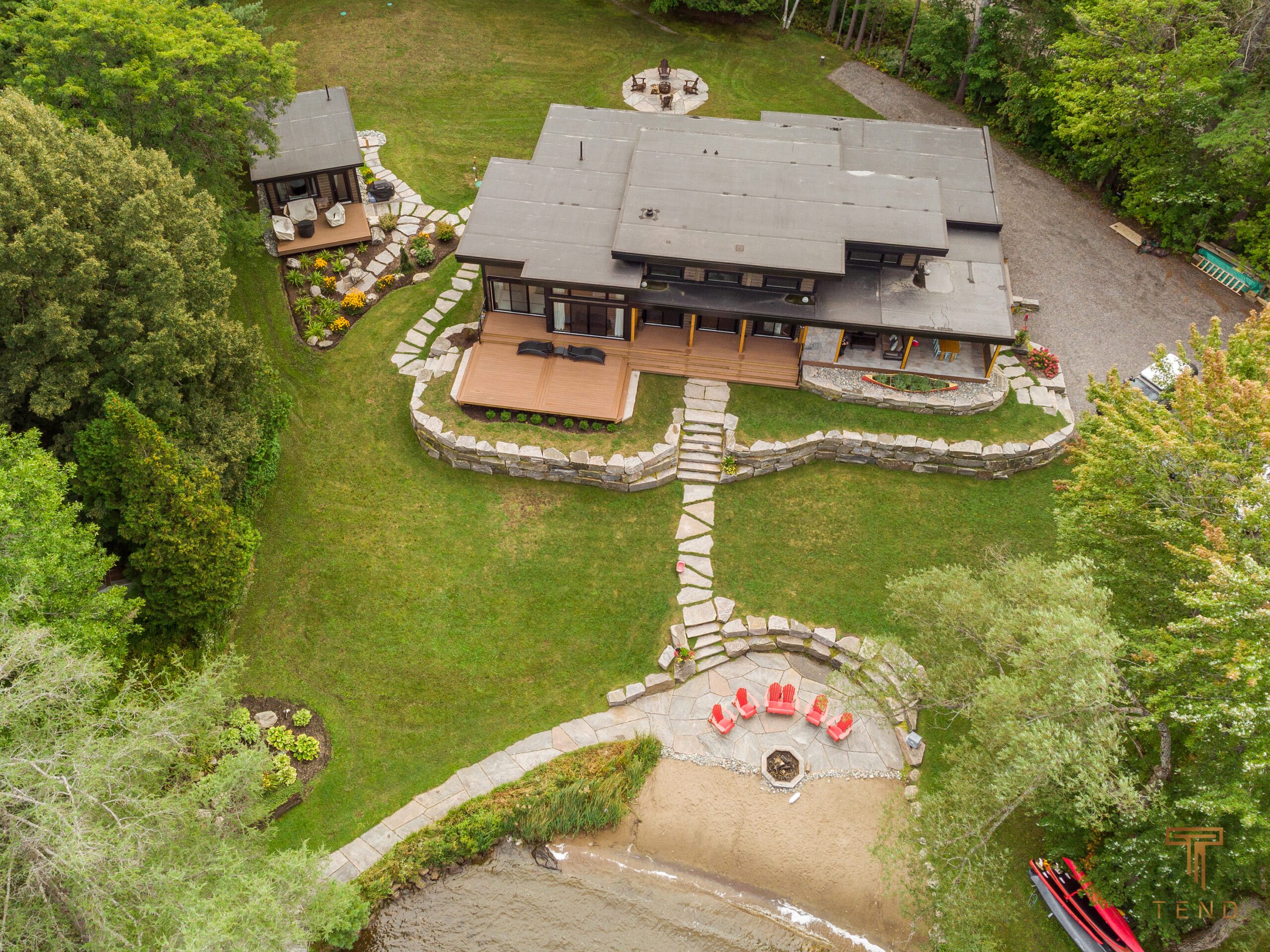 Driftscape gives visitors all the luxuries of a newly built cottage while maintaining it’s cozy Muskoka charm. Located centrally at Walkers Point on Lake Muskoka this property features tons of flat lawn areas and a large sloping beach, perfect for games, swimming and families of all ages. The main cottage has 3 bedrooms and 2 full bathrooms, a picturesque 3-season Muskoka room featuring a gas fireplace and a TV
