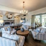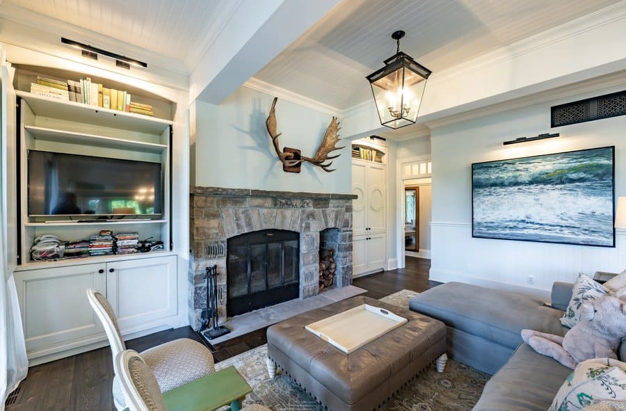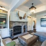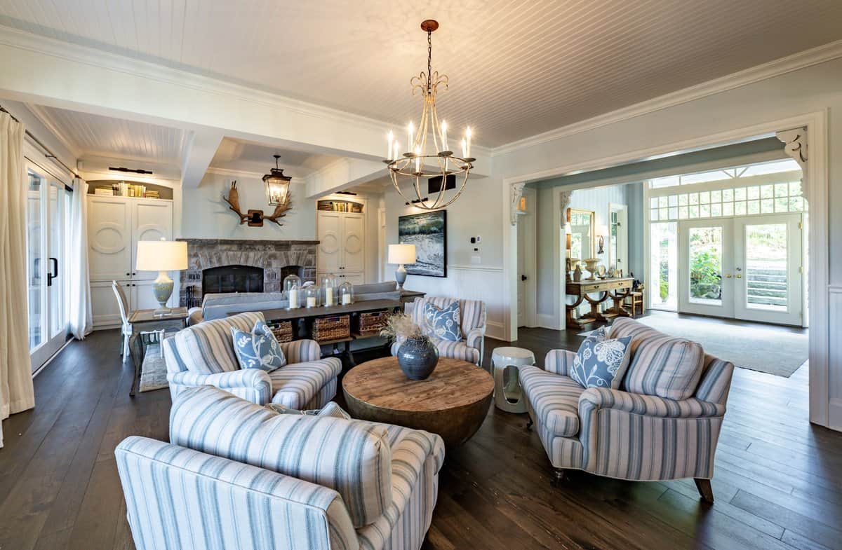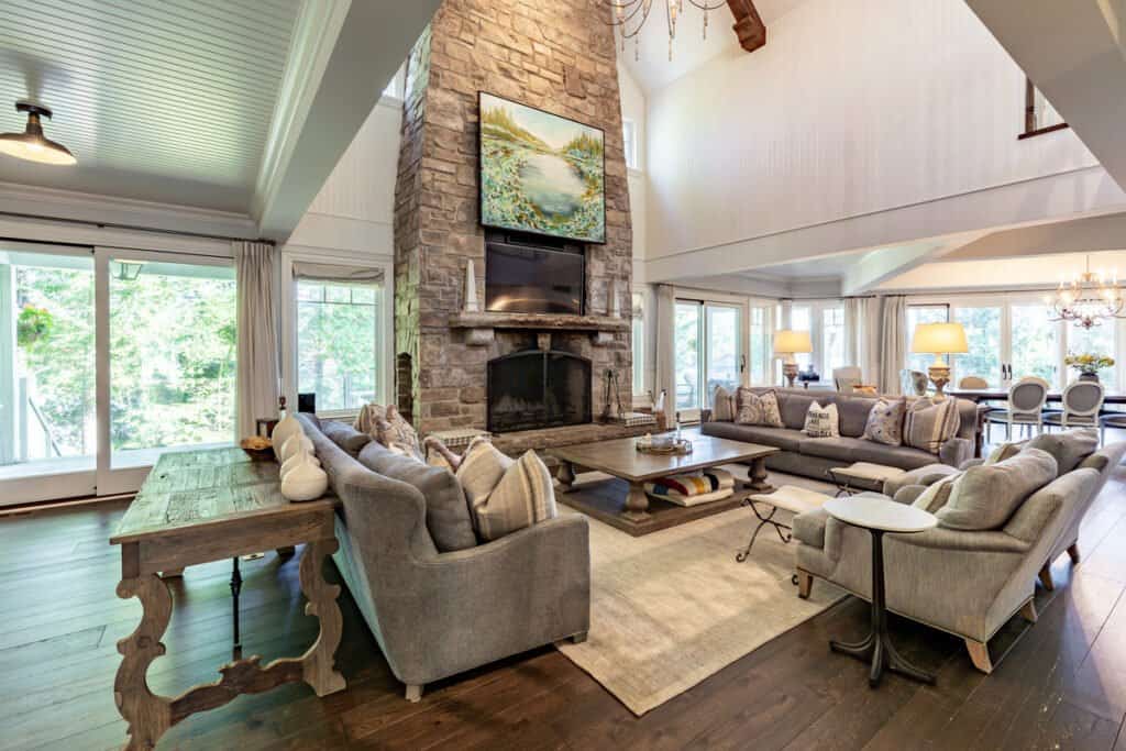 Two linen sofas and chairs surround the towering stone, wood‑burning fireplace that scales the wall. Vaulted ceilings with beams frame a majestic chandelier. A TV can be found in the antique armoire.