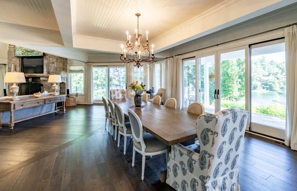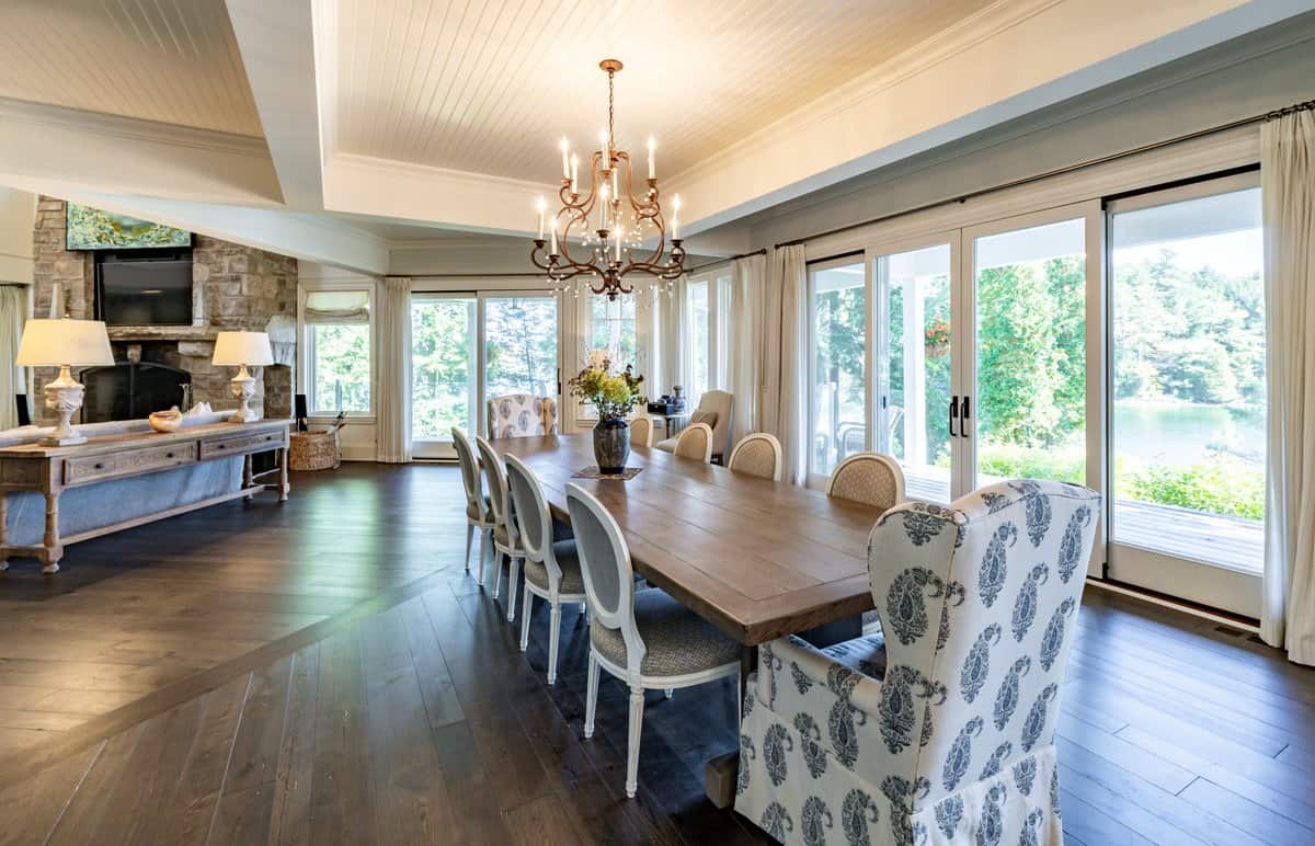 A royal room, featuring a round table with seating for 6 beneath a beautiful chandelier. A woodburning fireplace creates the perfect evening ambience. Walkout to the wrap around deck.
