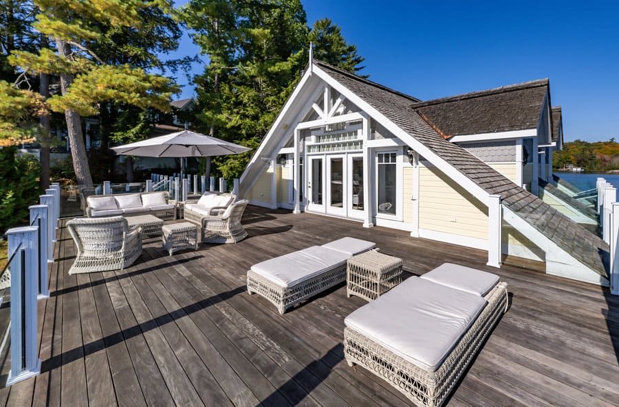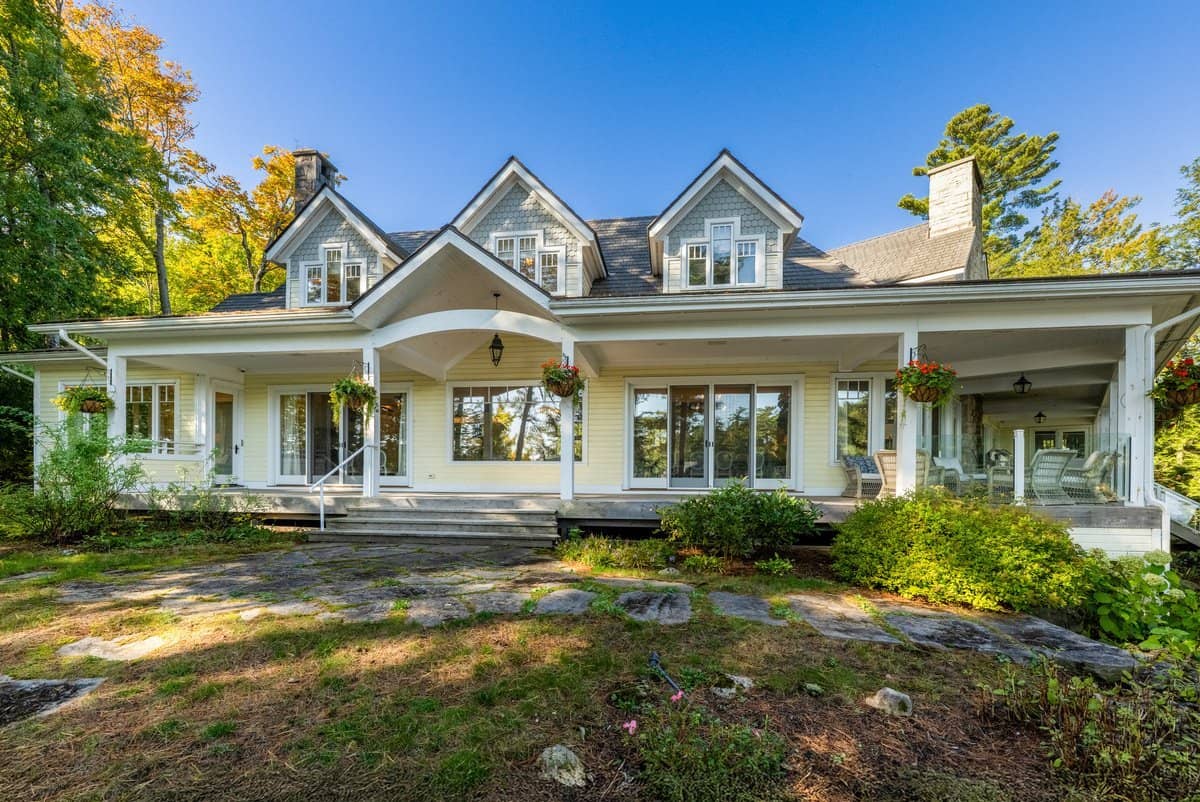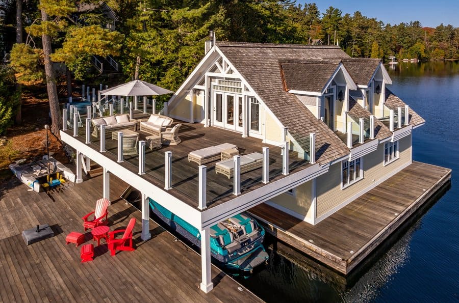 Arrive to the cottage via one of our most beautiful driveways – a descending cottage road adorned by towering pines and granite rock. A wrap around deck features an abundance of outdoor seating offering great vantage points for lake views. A walkway framed by glass railings leads to the boathouse where loungers and more seating invite you to bask in the sun. A hot tub is featured in its own little section of the dock. As the sun begins to set, make your way to the fire pit where 6 Muskoka chairs circle round.