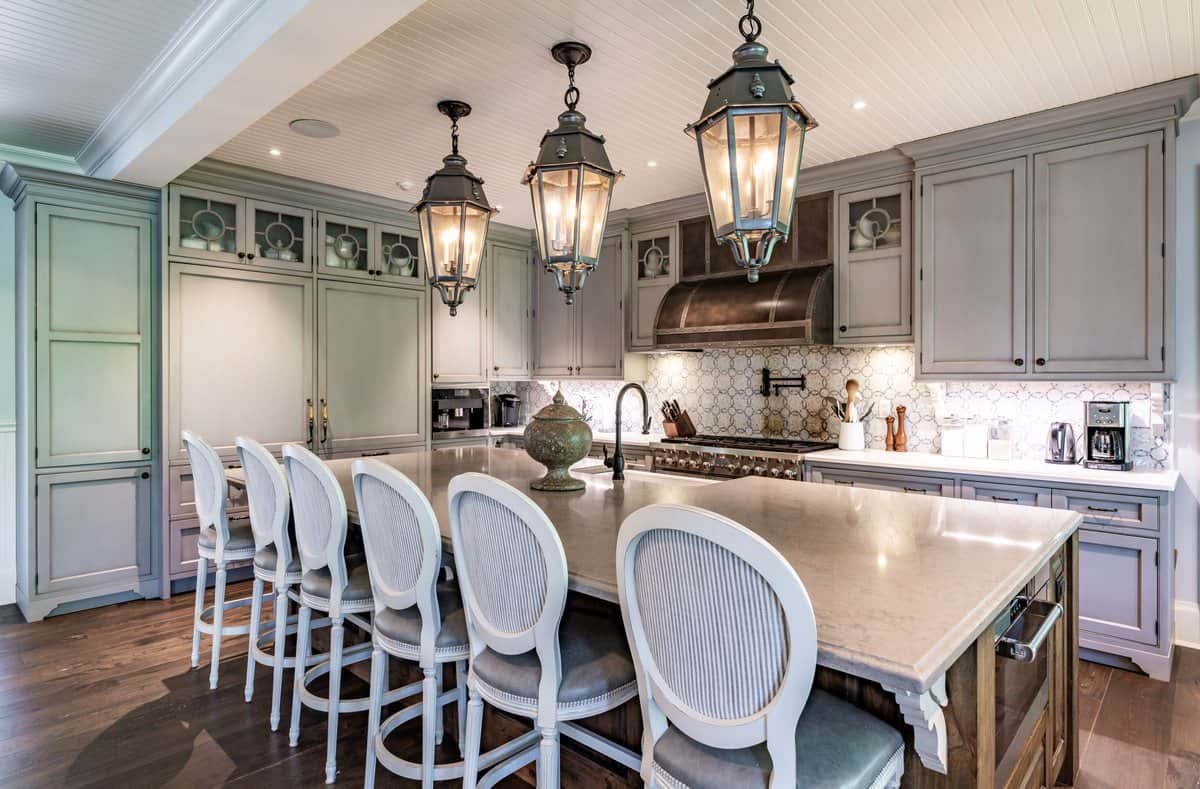 Boasts two oversized fridges with freezer drawers, a built‑in Meile coffee maker, Wolf 8 burner gas range and oven beneath a custom range. Centred in the heart of the kitchen is a large island with seating for 6 beneath 3 beautiful lanterns. The island also features a large sink, 2 Miele dishwashers, microwave and Wolf mini oven. A butler’s pantry with separate access features 2 wine fridges and an industrial size walk‑in fridge.