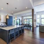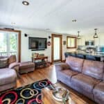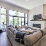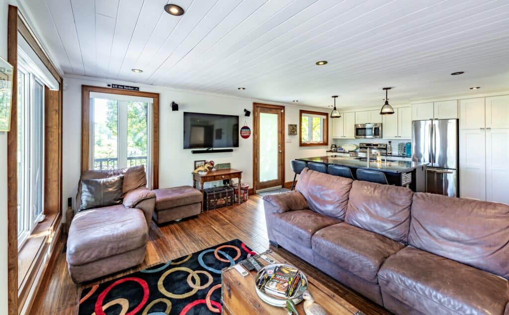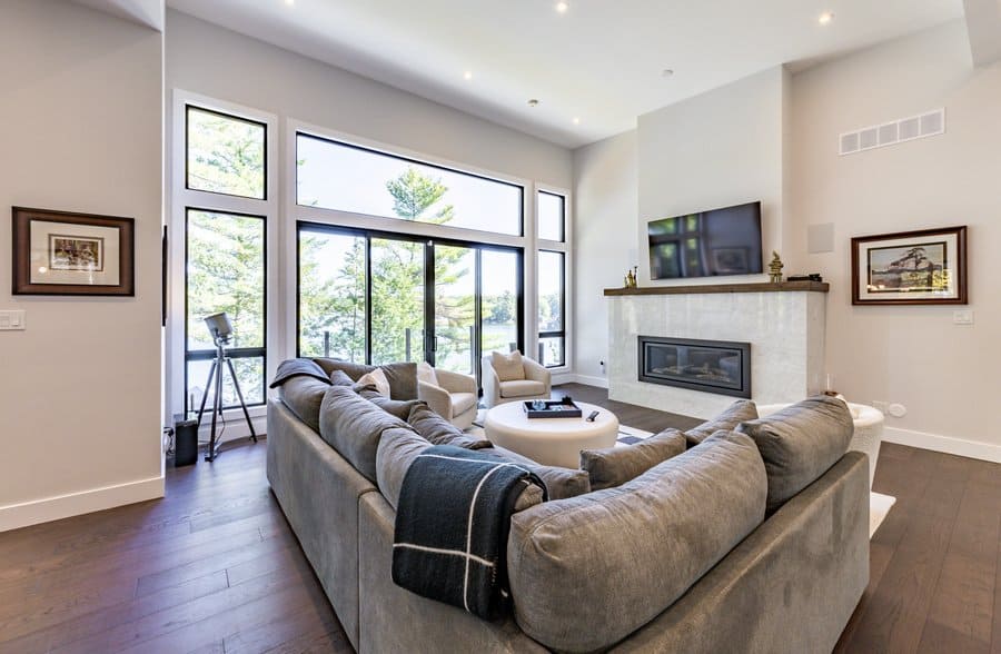 Spacious open concept modern design with floor to ceiling windows, smart TV, gas fireplace, sectional sofa, 3 chairs and walkout to large deck