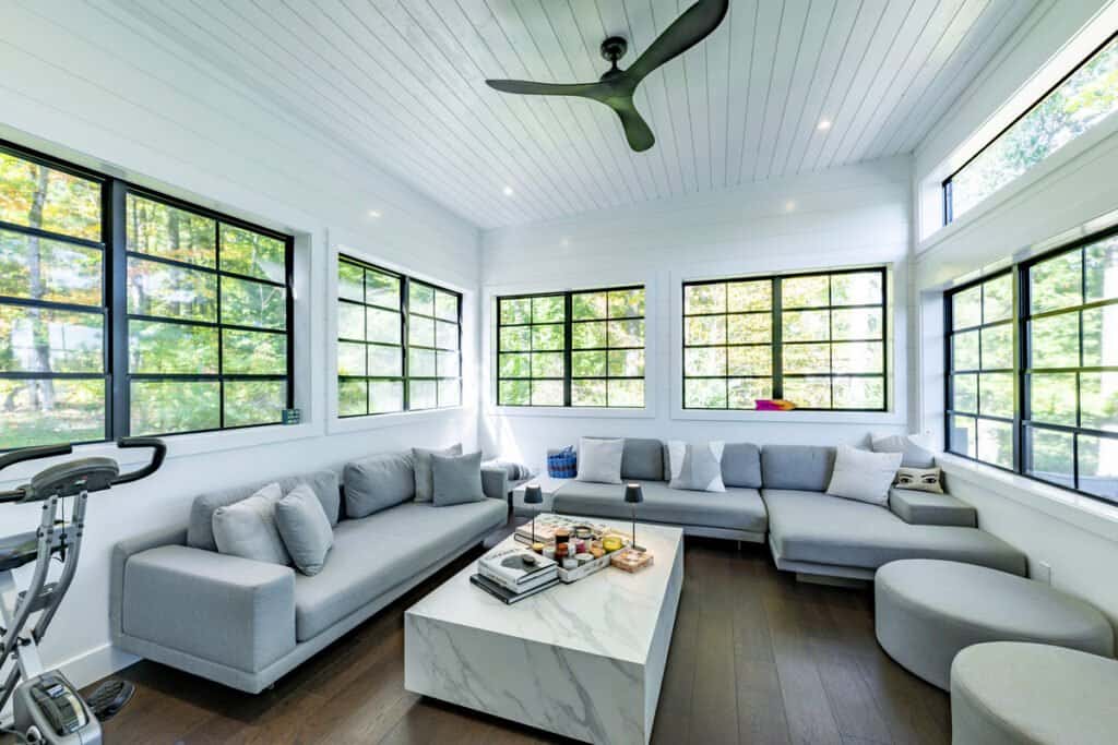 Large screened in room with modern L‑shaped sofa, 3‑seater sofa, 2 ottomans, upright bike and a walkout to upper deck.