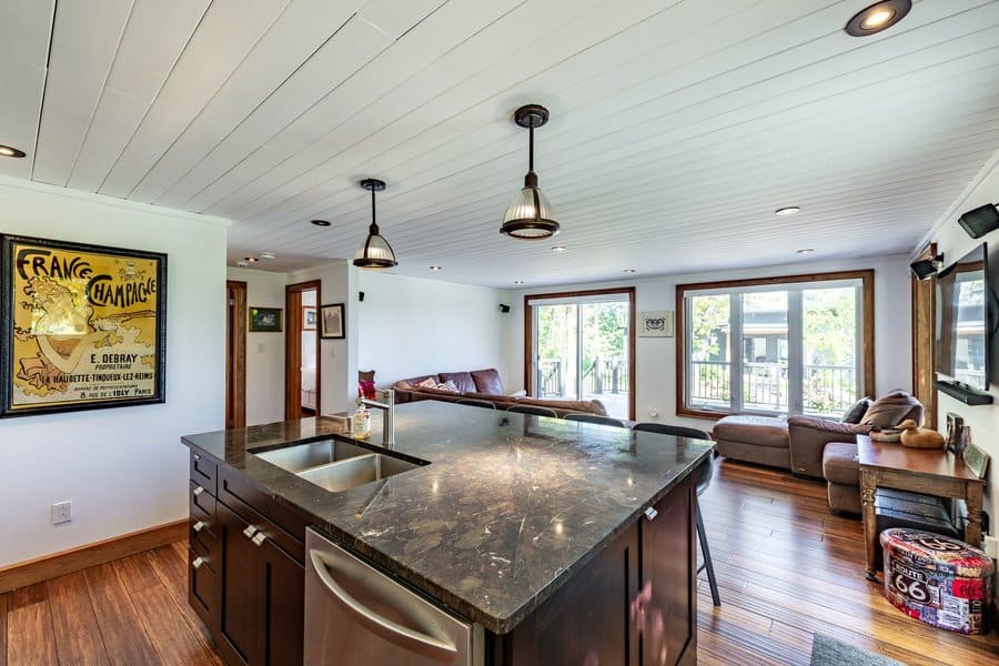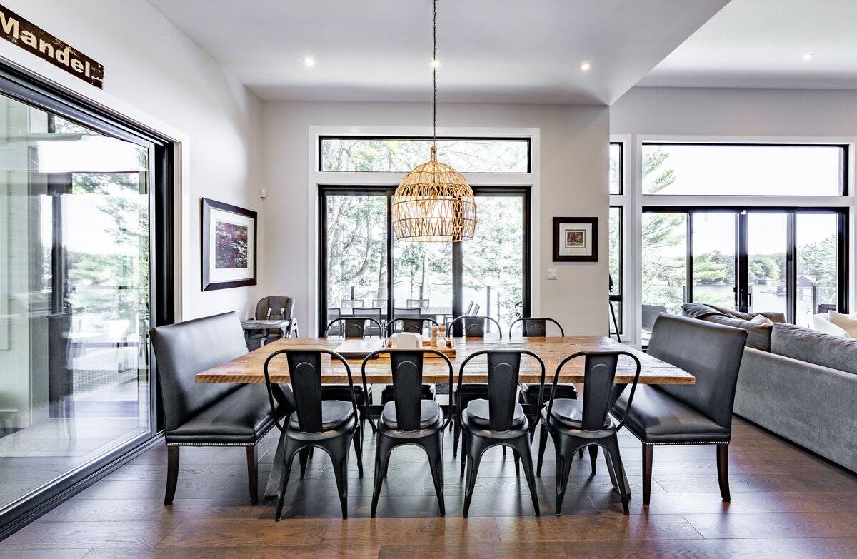 Open concept dining with seating for 12 as the table has 2 unique double seats, plenty of light and walkout to deck or Muskoka room.