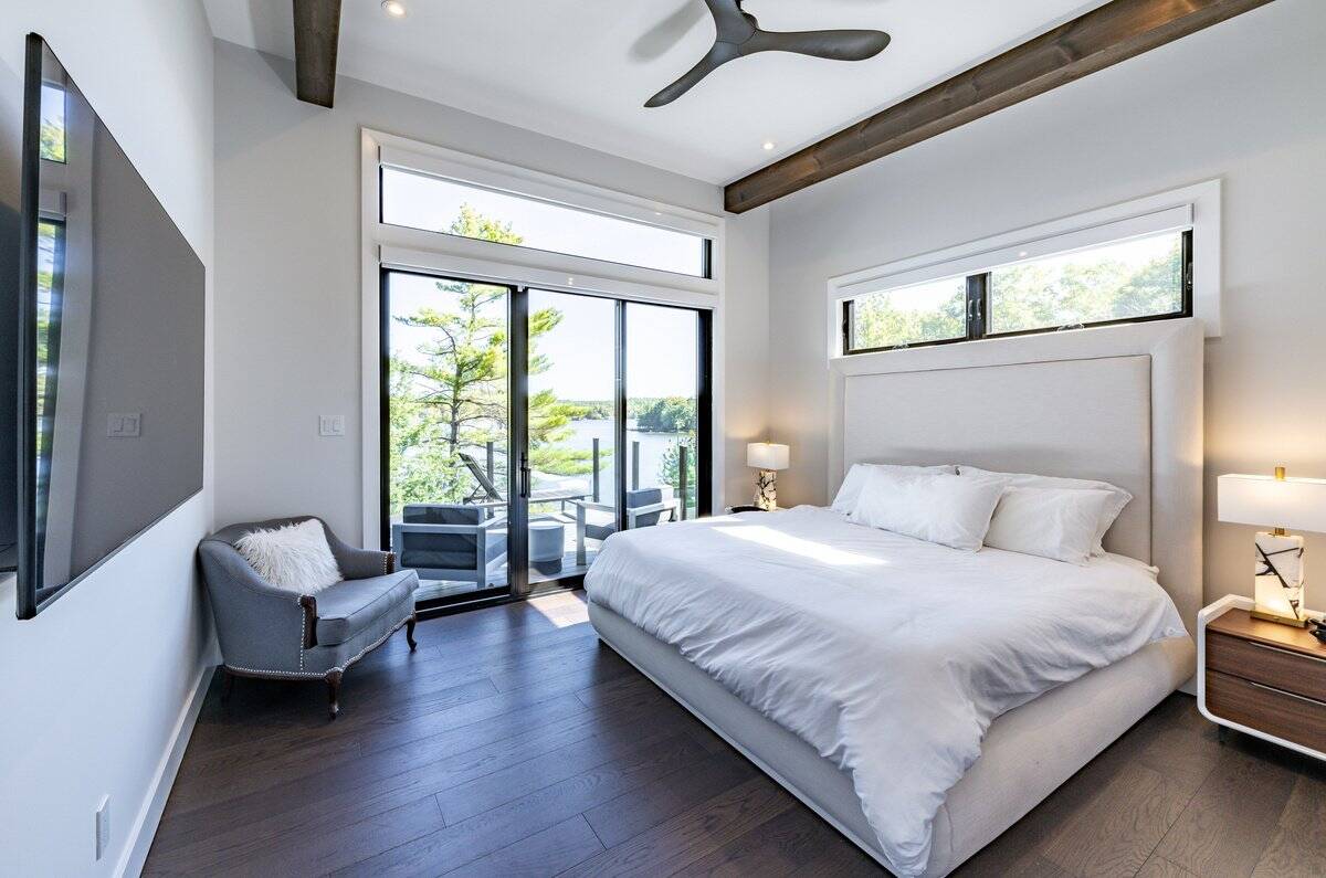 - Bedroom 1 – King (Primary) with ensuite, TV, walk‑in closet and walkout to deck