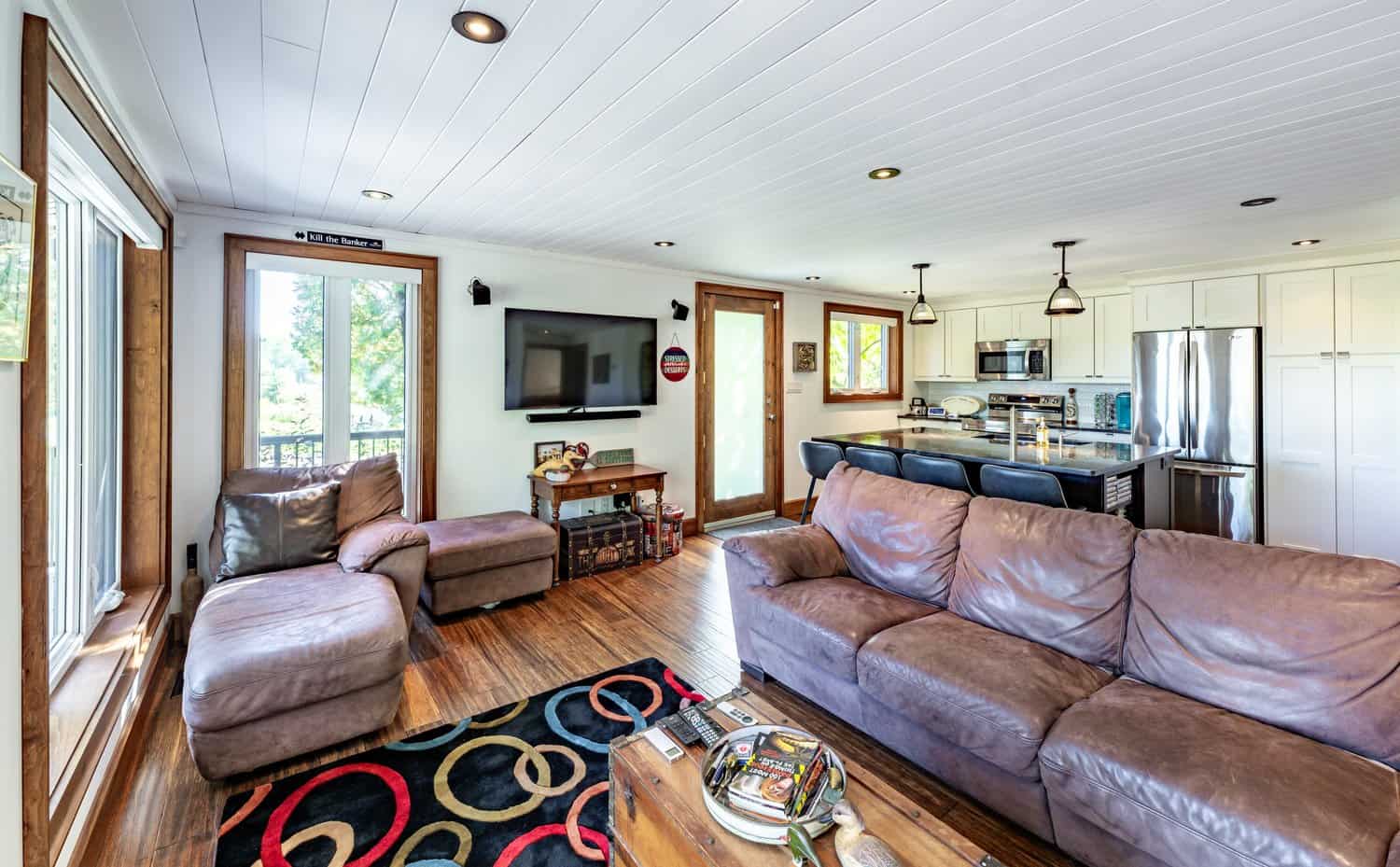 Open concept with curved sectional, smart TV, chaise lounger, chair and walkout to deck.