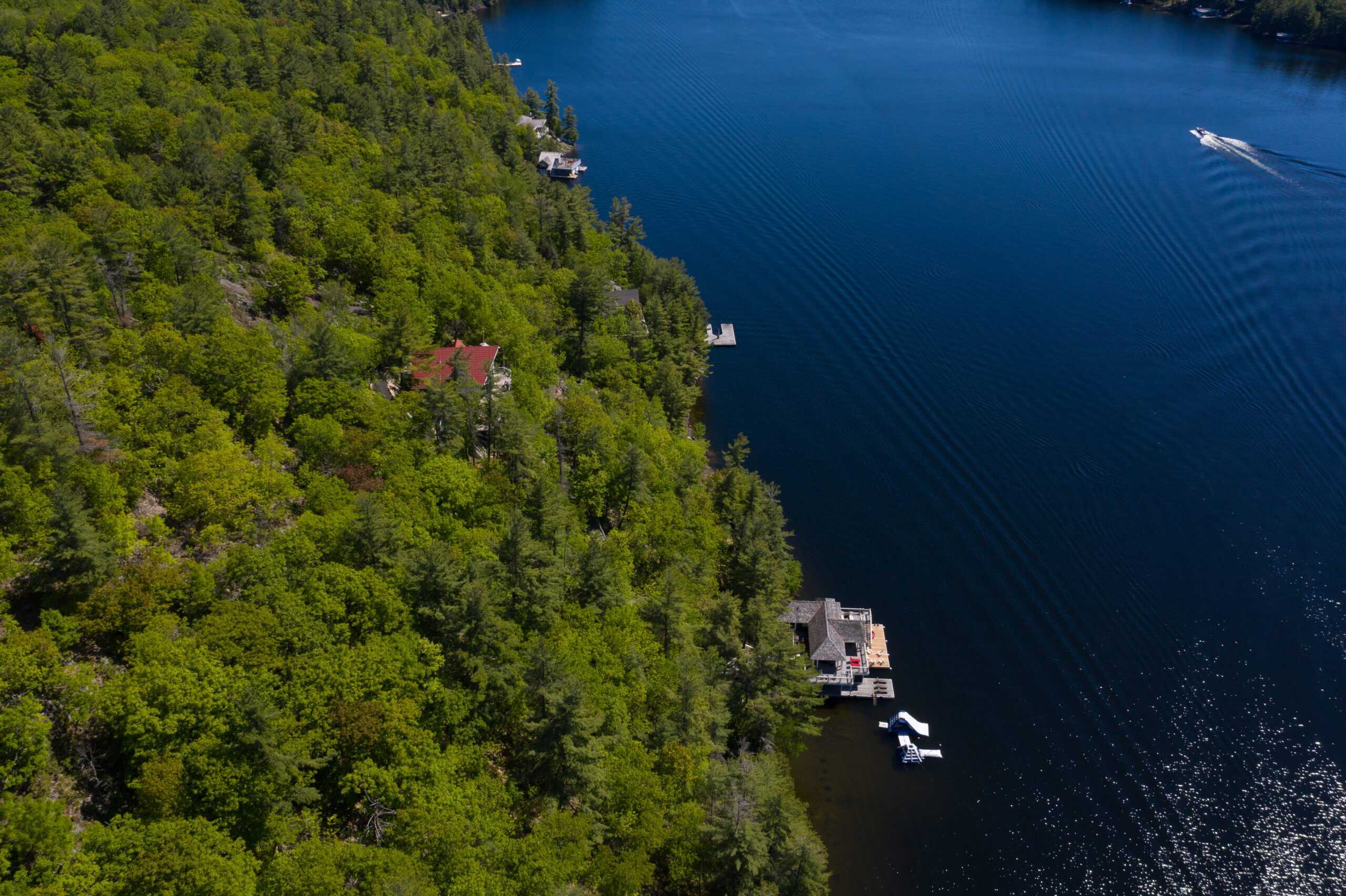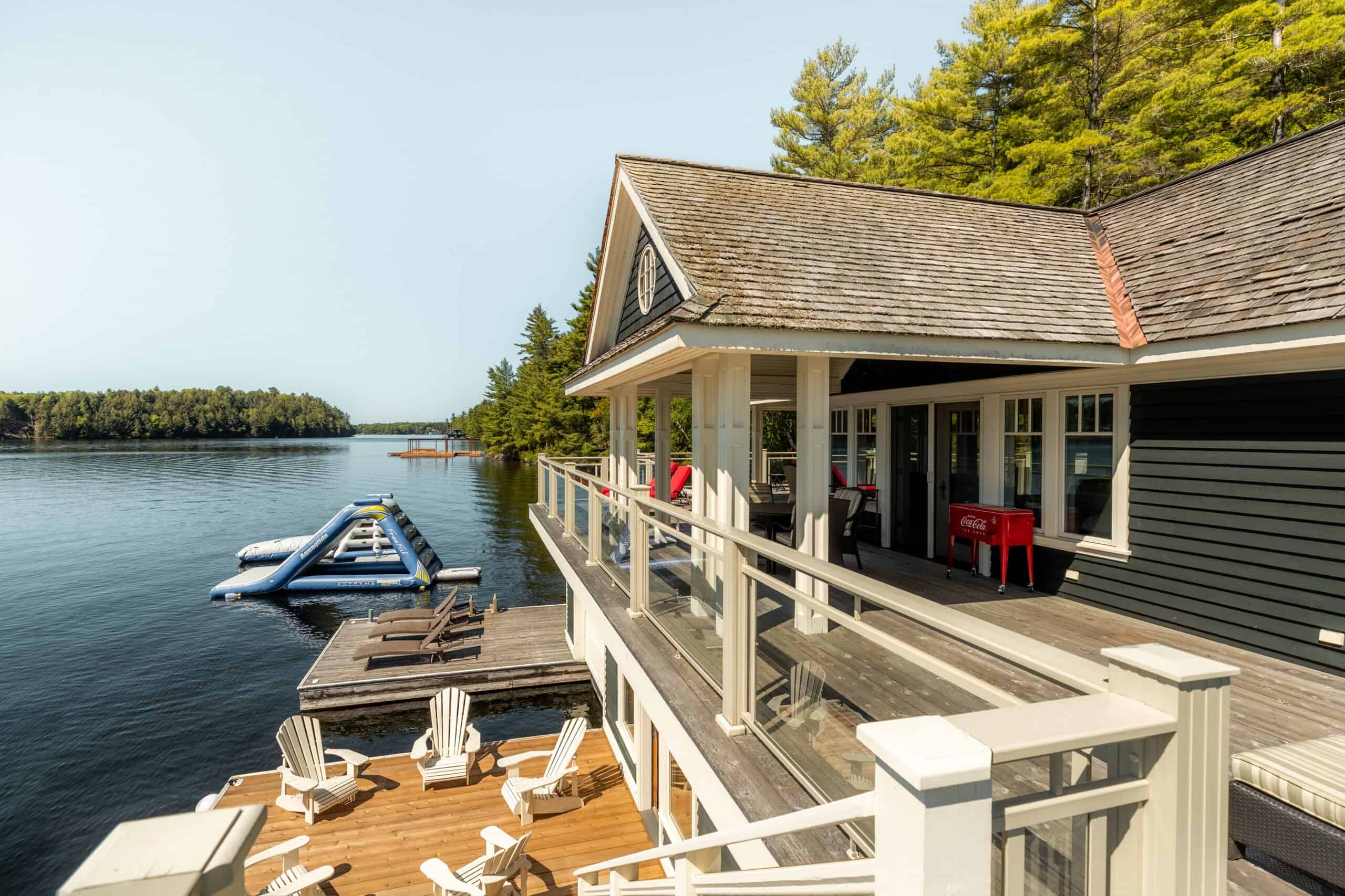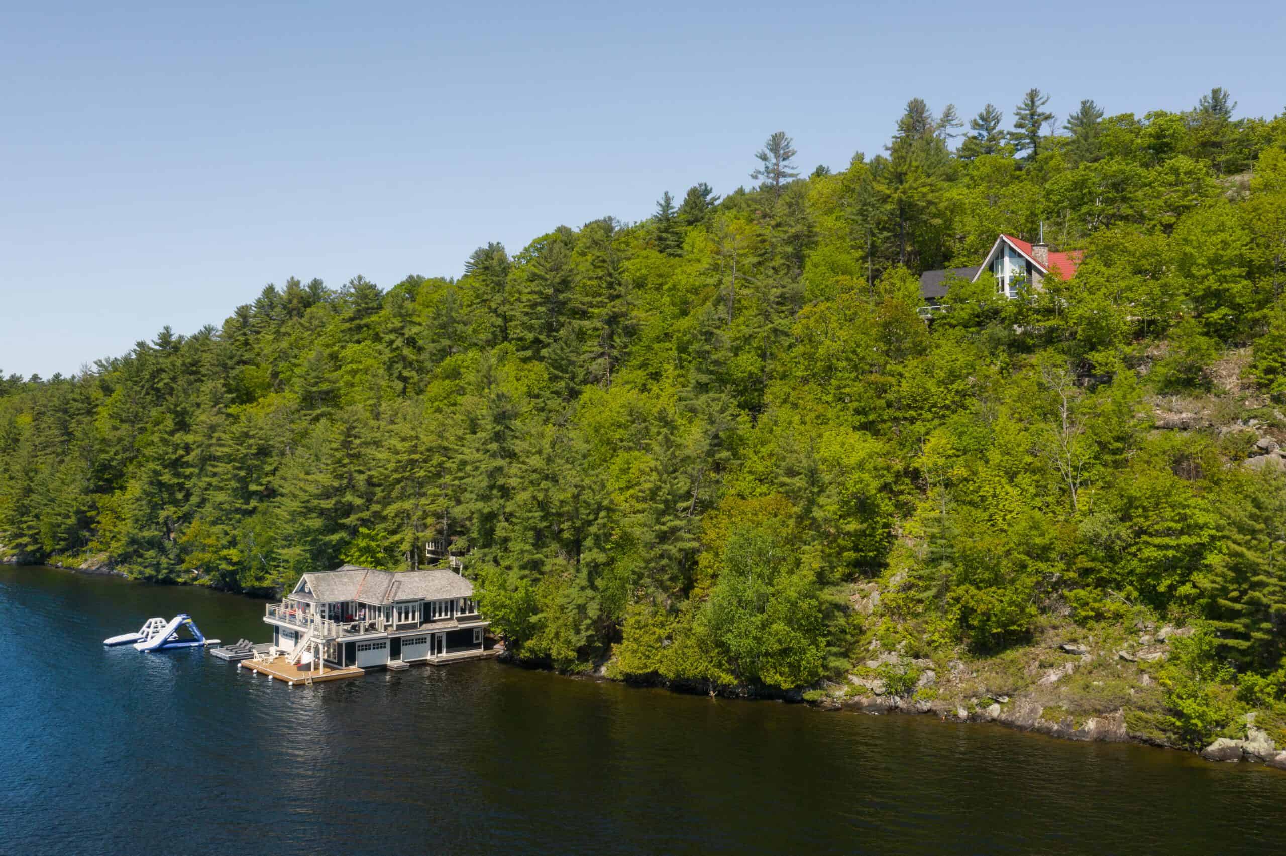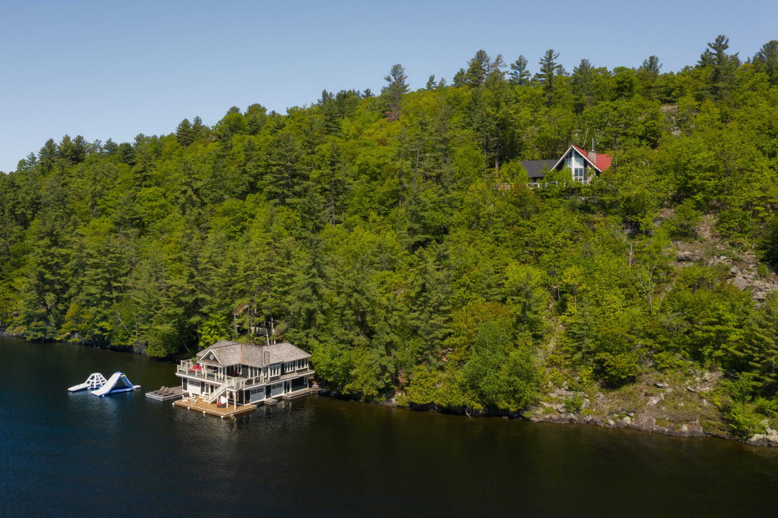 Located on Skeleton Bay on Lake Rosseau with great privacy and 260ft of shoreline, this cottage provides many spaces for entertaining, hosting, and lots of space for guests between the main cottage, boathouse and bunkie. Situated on 4.5 acres, provides privacy while remaining in the hub of the Muskoka Lakes. The deep water off the dock provides great opportunities for water sports, the inflatable slide and jungle gym, boating, diving and more.