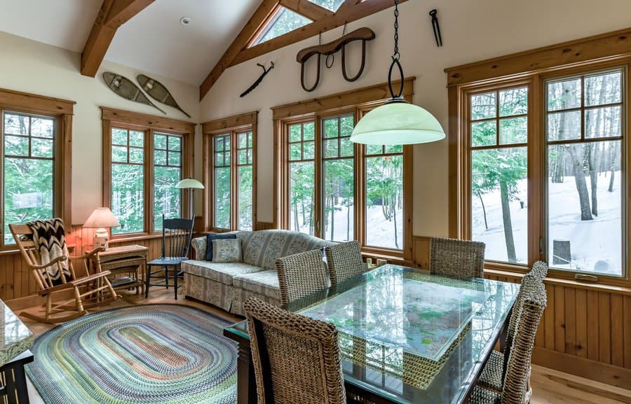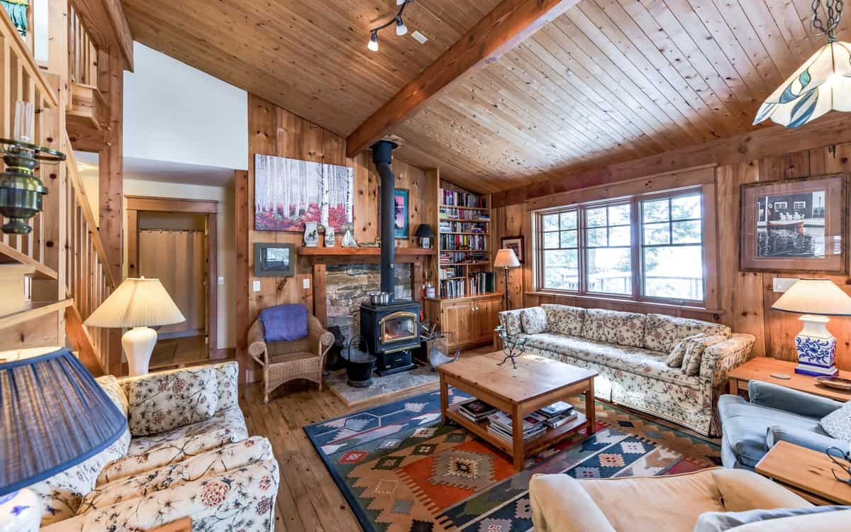 Expansive great/living room with wood‑burning fireplace, loads of windows, spacious, cozy and bright.