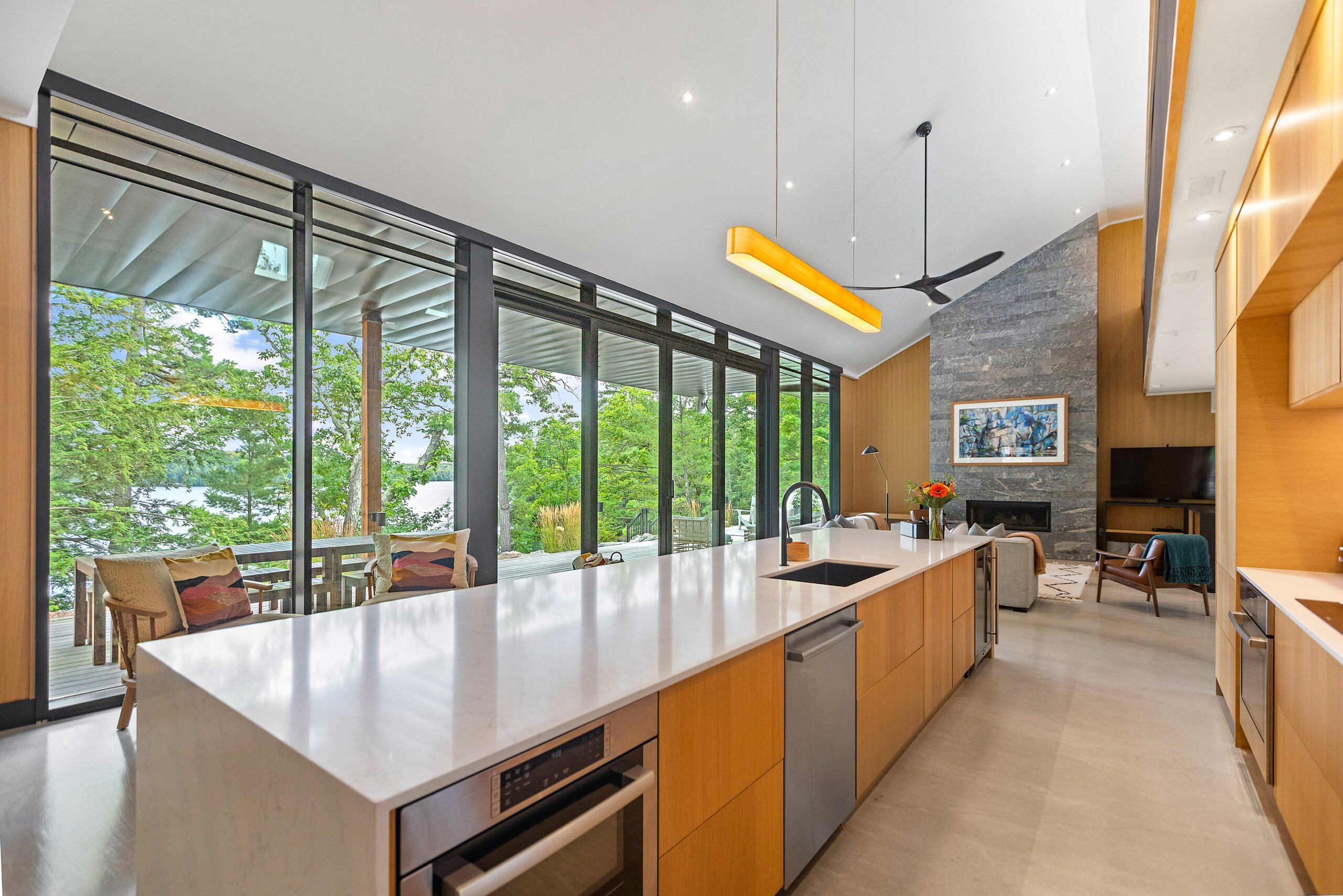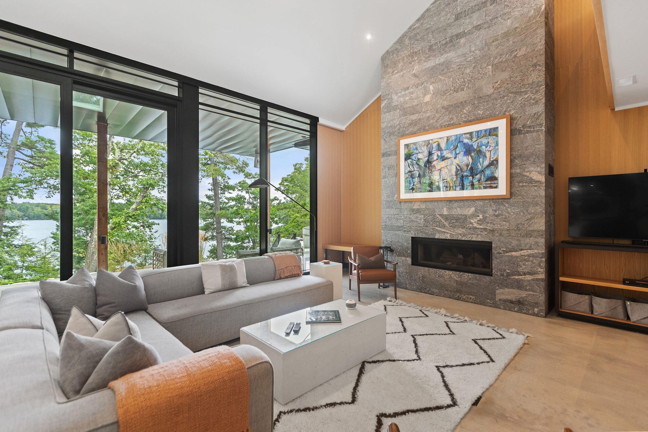 Perched above the shoreline, this elevated cottage makes for breathtaking lake views and features indoor and outdoor fireplaces. This brand new custom-built cottage features elegant modern finishings set in a very comfortable and functional escape on Lake Joseph equipped with a boathouse and sundeck. The boathouse upper-level sundeck is ideally situated for entertaining or enjoying the afternoon or evening sun. Floor-to-ceiling windows in both the kitchen and dining areas and a walk-out deck that spans across the entire lakeside of the cottage, bring the relaxing beauty of nature directly inside. The indoor/outdoor Muskoka room is perfect for enjoying a morning coffee or evening beverage across 3 seasons. The fireplace’s ambiance provides warmth on cooler nights and sets the mood in the summer, with a picturesque view overlooking the lake. This cottage is perfect for those looking to get away, find peace and quiet in tranquillity, and have the amenities and features of a centrally located, brand-new modern cottage with all that Muskoka offers.