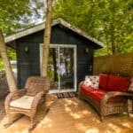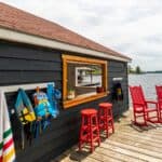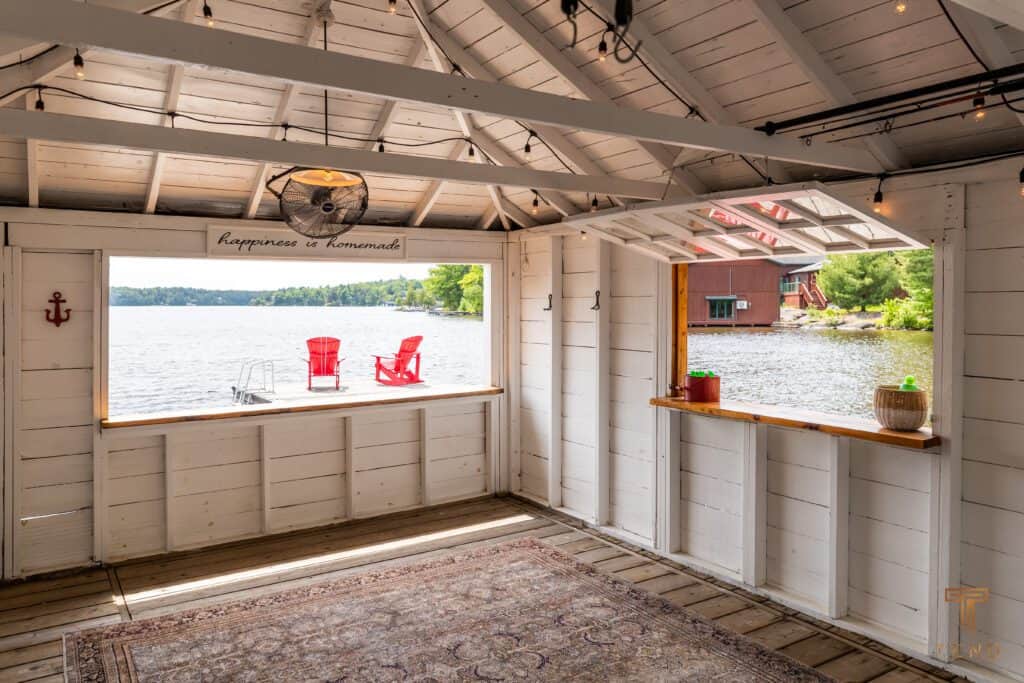 Returning outside, a rustic dry-dock boathouse compliments the deck, an indoor-outdoor lounging haven to take reprieve from the sun while enjoying the refreshing cool lake breeze and splendid lake views.