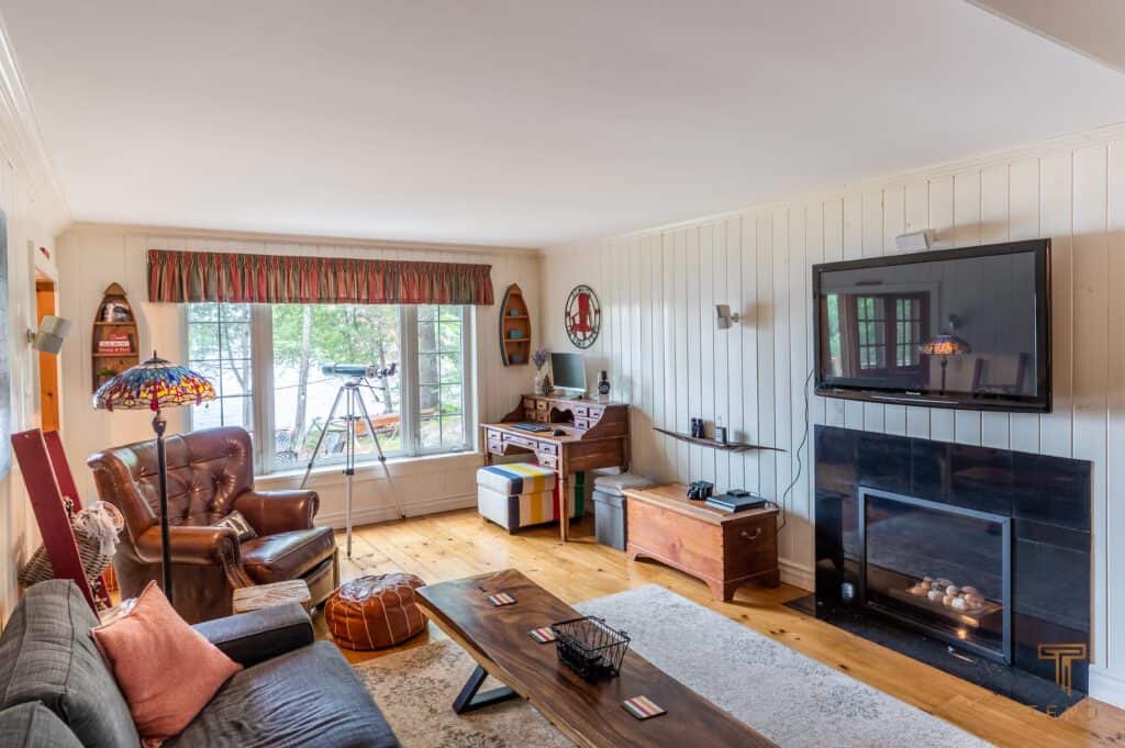 The 1,800+ sqf cottage accommodation includes on the main floor a Muskoka room, family room, fireplace, dining room, 3x bedrooms, office (with 4th bedroom conversion option), bathrooms (3x full) and additional sitting areas – all wide-planked flooring and surrounded by high quality windows to enjoy lake and garden views. At the back of the cottage, an over-sized 40,000sqf open undulating green-space to do whatever the heart desires.