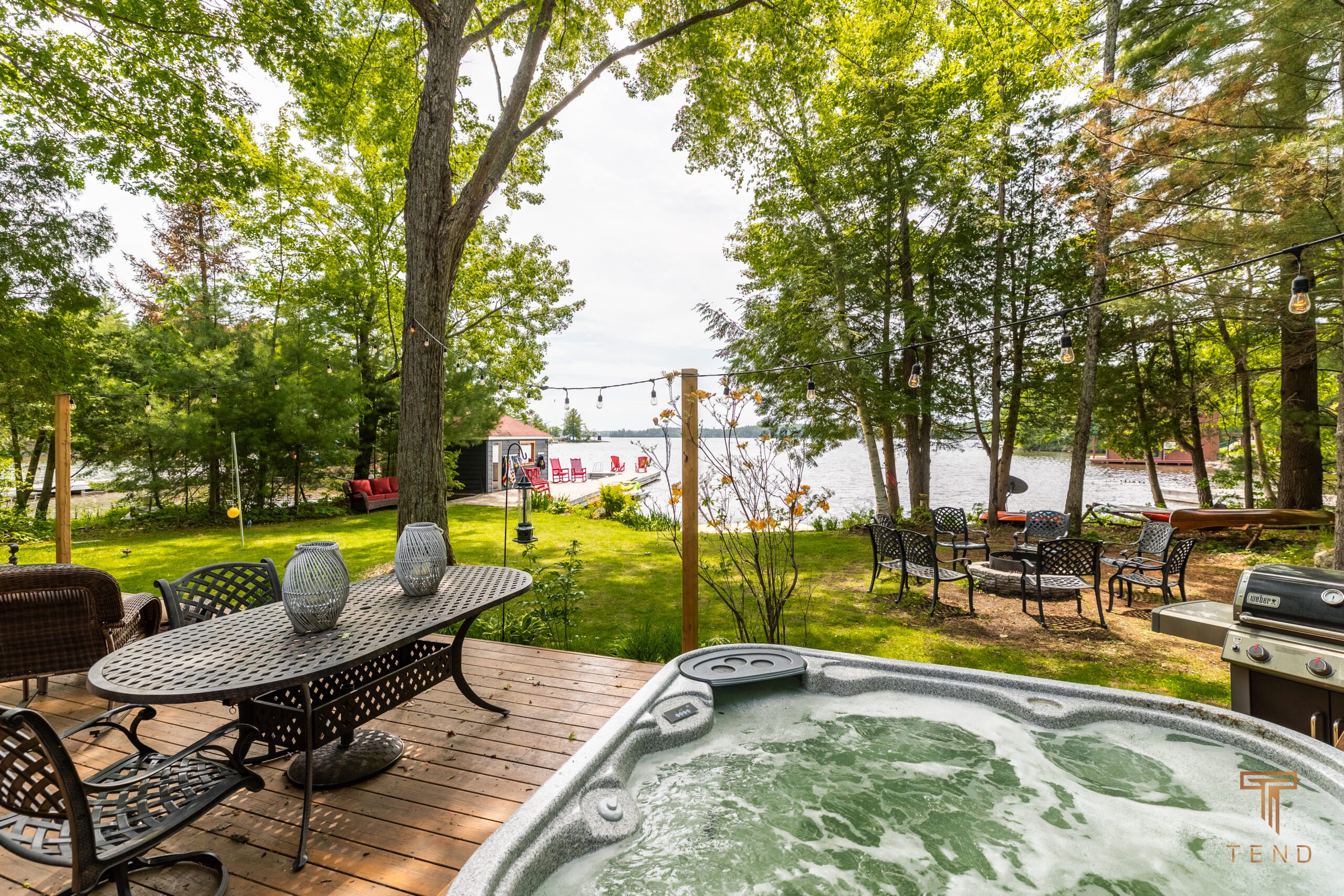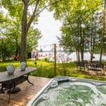 The cottage is set back just 50’ from the water, with 500sqf flat green grass spacing the cottage and the water. Take-in the magnificent South-West views from the deck, with full day sun to maximize water play and outdoor lounging. Warm up in the deck jacuzzi, and watch the sun set or rise over the bay’s Easterly tree-lined horizon, whatever your pleasure.;