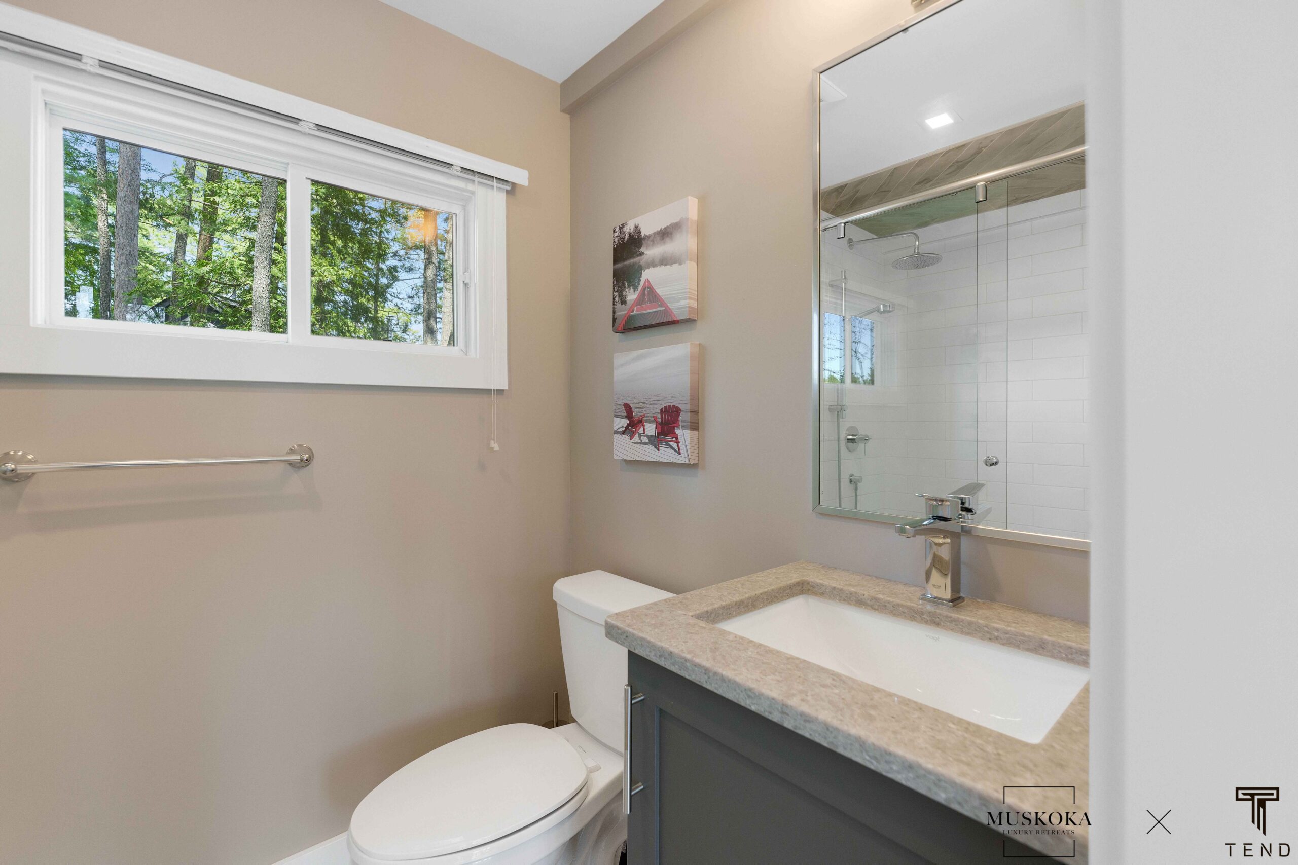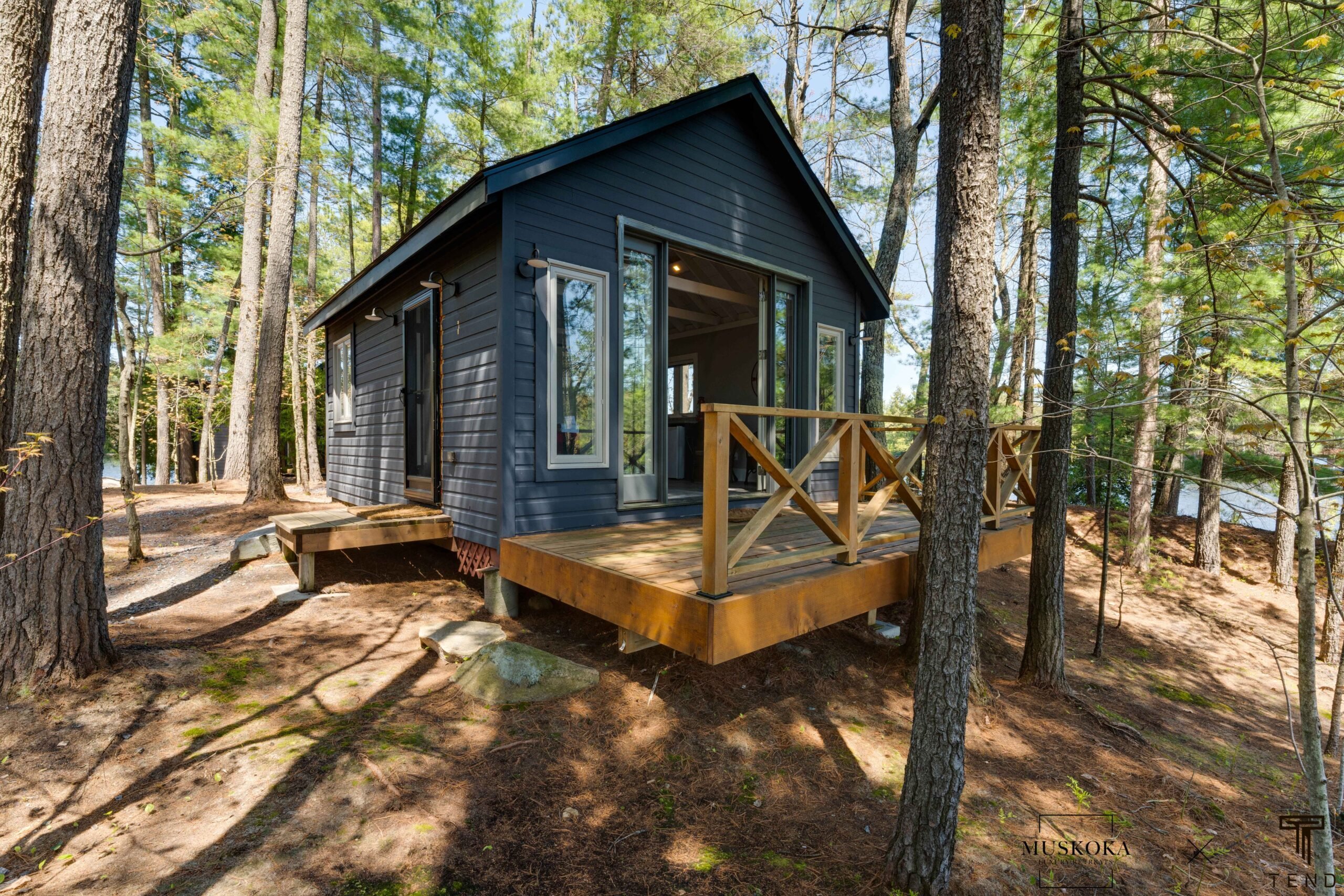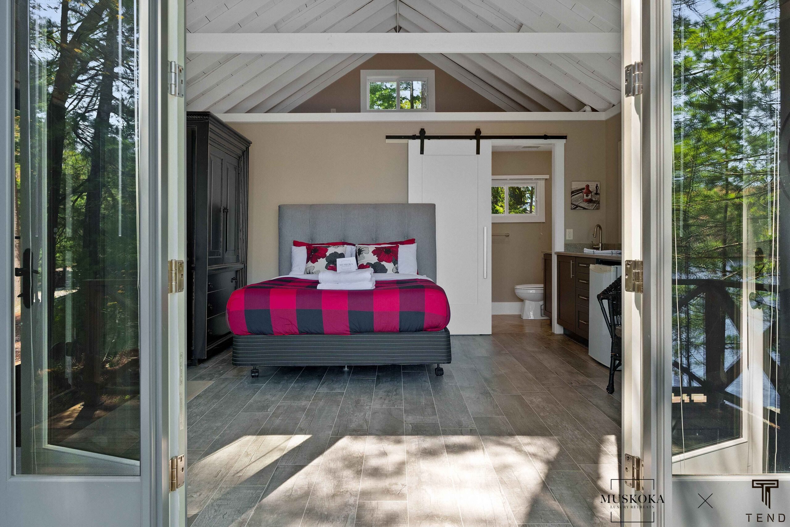 The bunkie is a separate building just a few steps from the main cottage. It features one bedroom and one bathroom, as well as French doors that open onto a deck overlooking the lake. The bunkie is beautifully decorated and provides a private and cozy space for guests who prefer a bit more privacy.